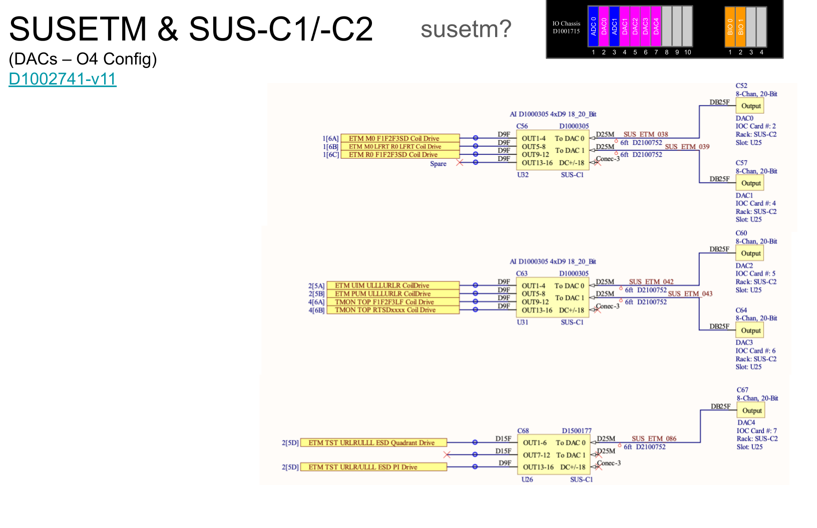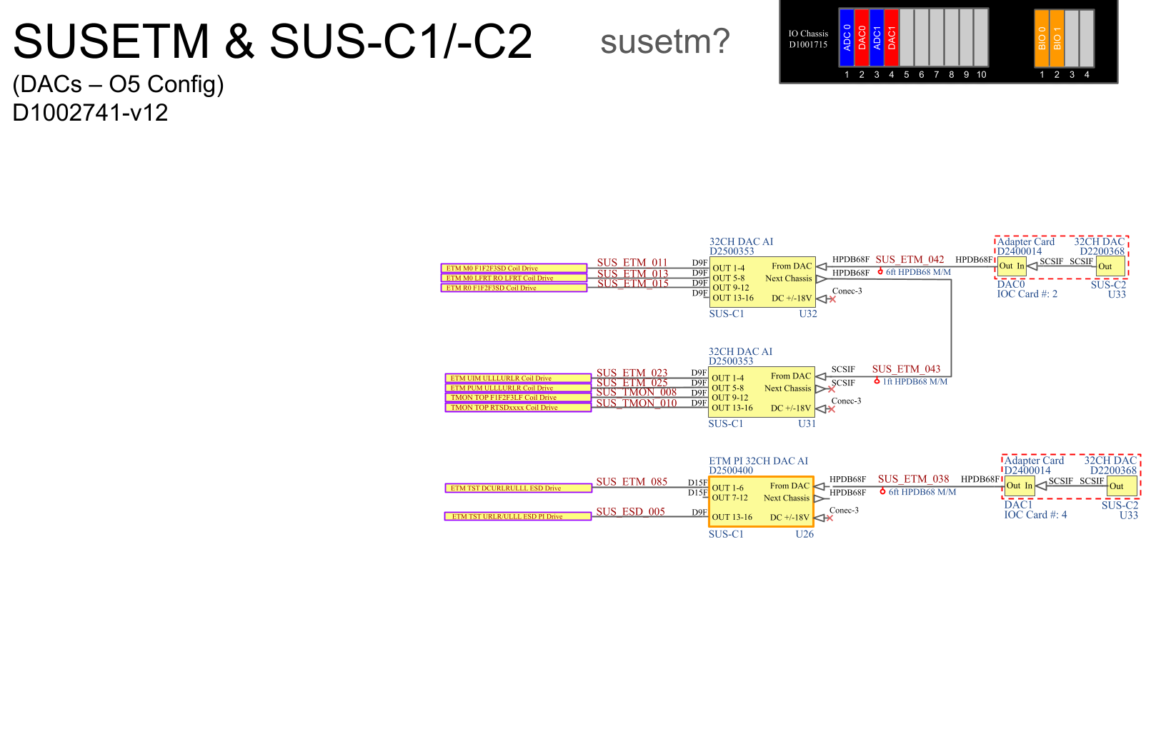 D. Sigg, D. Barker, F. Clara, O. Patane, J. Kissel ECRs: E2400409 and E2500296 IIET: 35739 and 35706, respectively WP: 12901 DWG: D1002741 Primary Change: Change the 18- or 20-bit 8CH DAC signal chains to 28-bit 32CH LIGO DAC chains - Consolidate all SUS signals driven by 5x 18- or 20-bit 8CH DACs (GS20AO8) onto 2x 28-bit 32CH DACs (D2200368) - Replace 18-/20- 8CH AI chassis assemblies (D1000305 and D1500177) with WD relays to 28-bit 32CH AI chassis assemblies (D2500353 and D2500400), which use the AI chassis back plane interfaces without the relays D2500097 - Upgrade representation of DACs on the signal connection page to show both DAC cards (D2200368) and DAC adapter cards (D2400014) - Update the graphical representation on the rack drawings page to show the new CARD arrangement in the SUS-C2 U25 IO chassis I've crafted a quick drawing of these primary changes, which are attached here, and Oli will post the official Altium version to -v12 D1002741 shortly. Clean-as-you-go changes: - Upgrade representation of ADCs on the signal connection page to show both ADC cards (GS16AO16) and Adapter adapter cards (D0902496) - Updated the connections and labeling for AA chassis for ADC1 to better convey the connections as a pick-off and "parallel" relay of the Transmon QPD A signals (using ISC End Station Wiring Diagram D1100670 and pictures of SUS-C2 ETMX (S1301904) and SUS-C2 ETMY (S1301919). - Some name / connection clean-up on the graphical representation of the rack drawings - TMS TOP drivers were Triple Top, now they're correctly Transmon top.