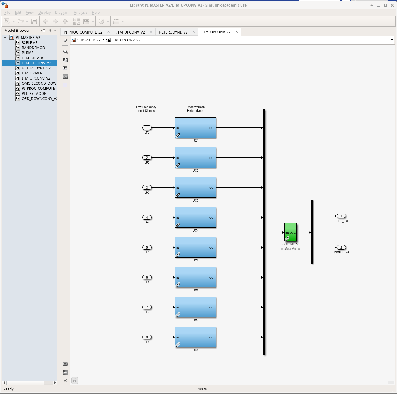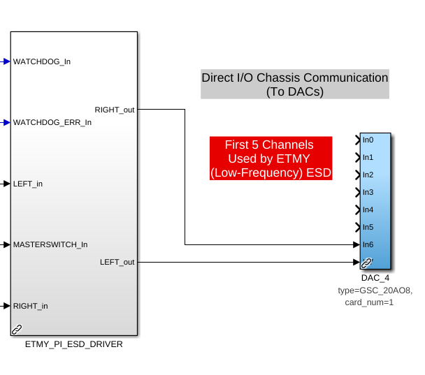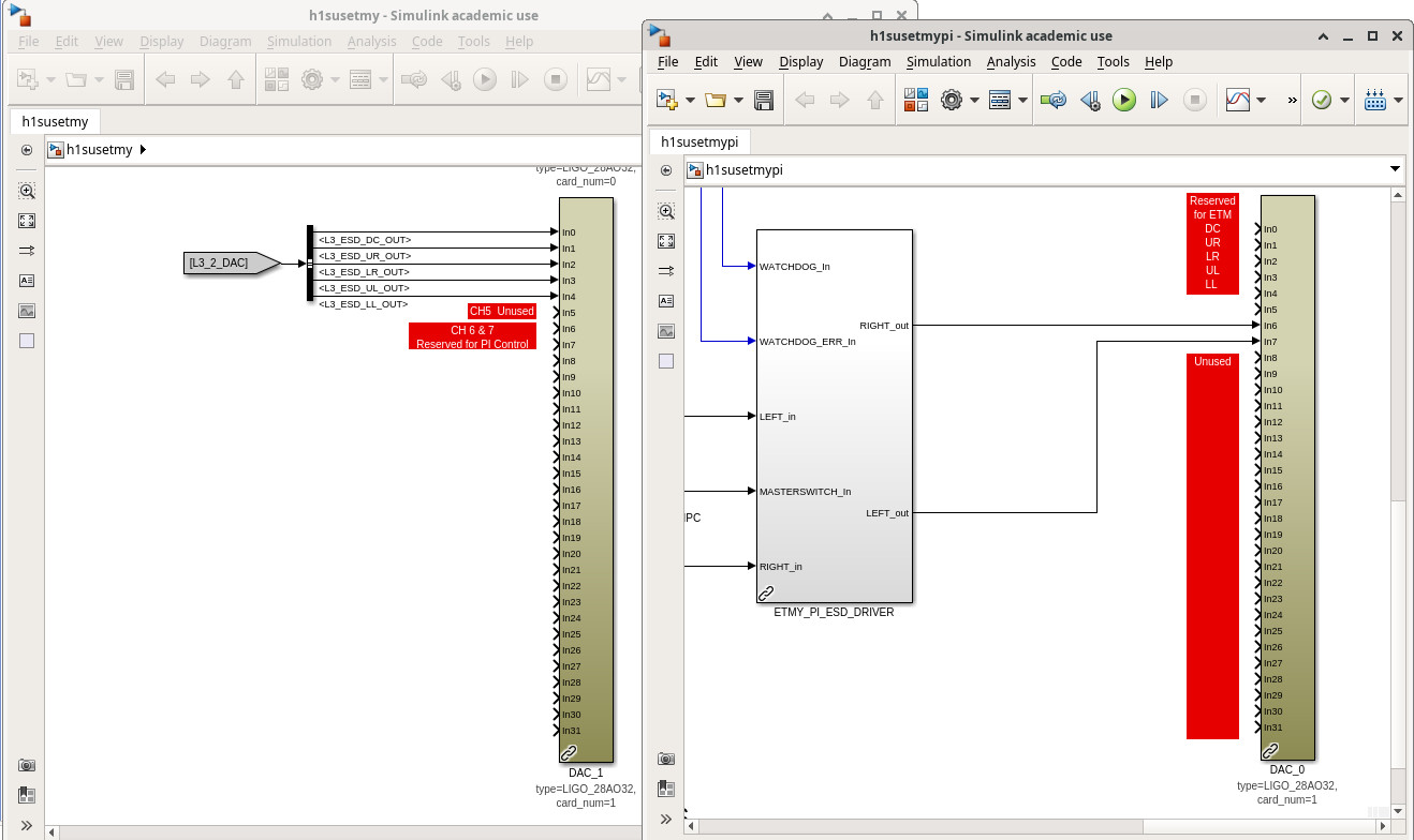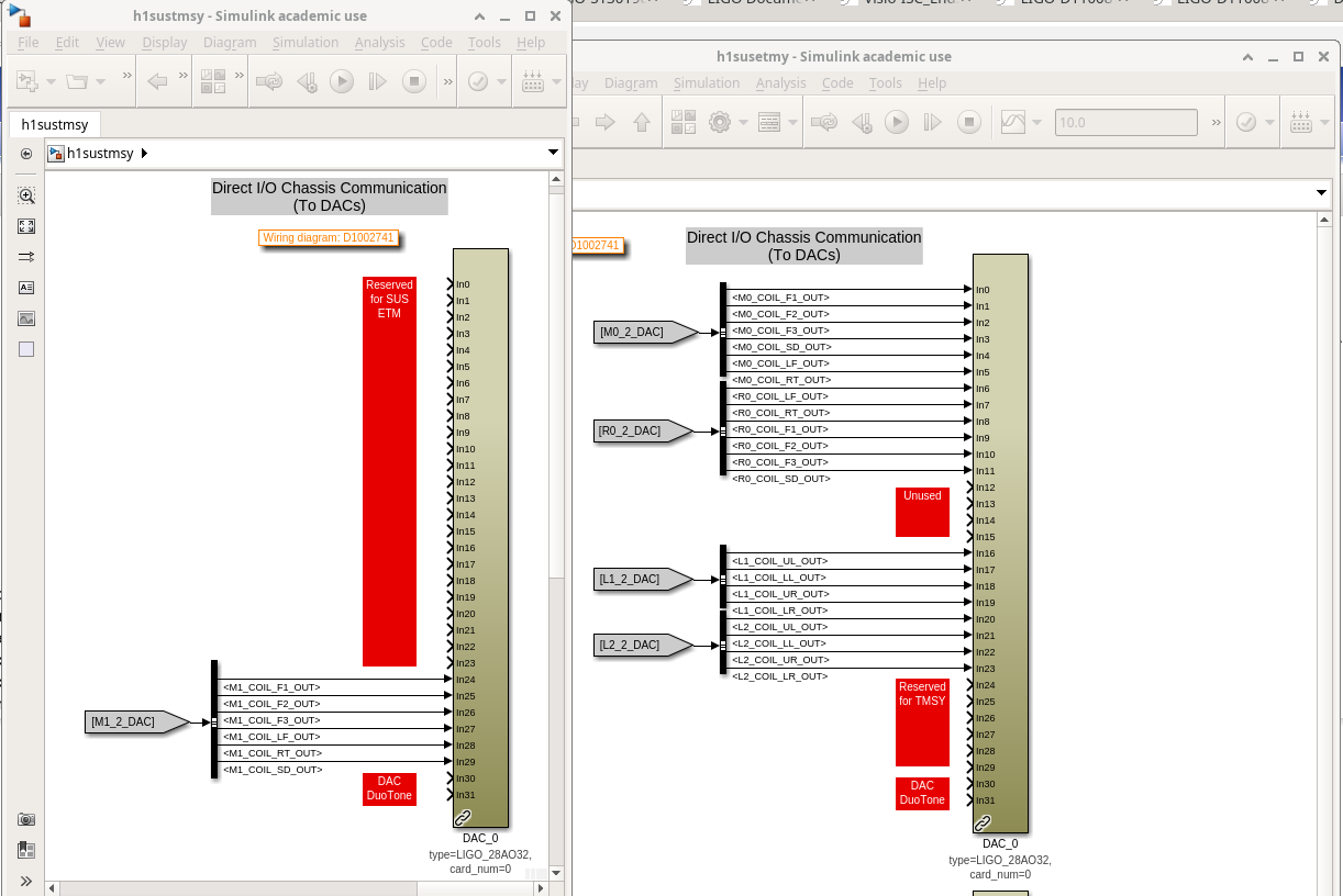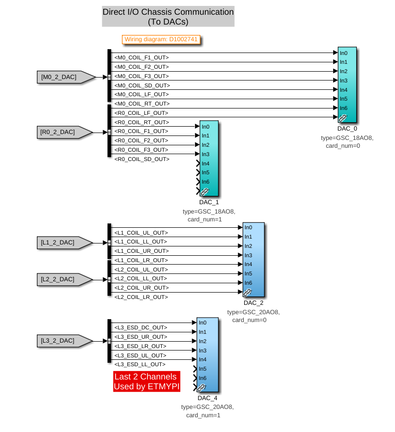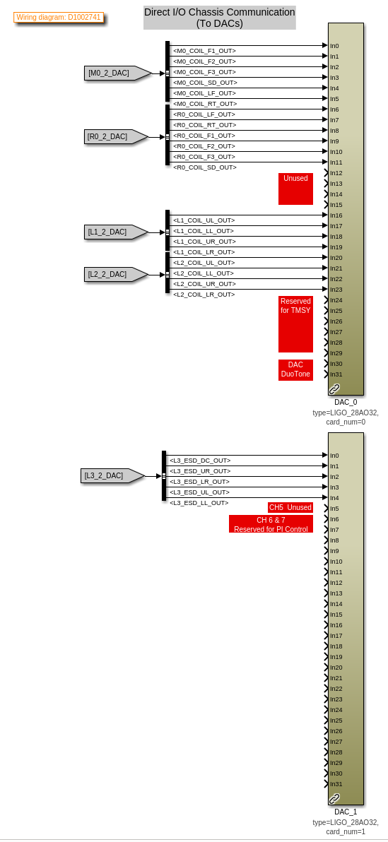 D. Barker, J. Kissel, O. Patane ECRs: E2400409 and E2500296 IIET: 35739 and 35706, respectively WP: 12901 DWG: D1002741 Following the solidifying of the wiring plan / IO chassis layout (see LHO:88276), Dave did the lion's share of updating the front-end USER models in prep to the 28-bit 32CH upgrade. I merely reviewed it to make sure we understood all the moving pieces and that the connections to the analog world made sense, and am documenting it here. Recall -- although the wiring diagram -v11 had shown all 20-bit DACs, in order to best reflect the 2022 ideal as of - TST stage :: ECR E1800306 / IIET: 11689, - PUM stage :: ECR E1900216 / IIET: 13232 - Everything else :: ECR E2100485 / IIET:20828, but H1 had not yet achieved that ideal, as we instead put our money toward developing and waiting for the 28-bit 32CH DACs. As such, in the "BEFORE" shots, you'll see the reality of the mix of 18-bit and 20-bit DACs. In short, the QUAD TOP (M0 and R0) and TMTS TOP (M1) had not yet been upgrade to 20-bit DACs. So those stages now "skip a version" and go straight to 28-bit 32CH DACs (D2200368). Attached are screen-shots of the DAC section of the user models BEFORE vs. AFTER: - h1susetmy BEFORE vs. AFTER - h1sustmsy BEFORE vs. AFTER - h1susetmypi BEFORE vs. AFTER I also include a view of the 28-bit 32CH DAC card usage from each model that uses it; a view which better shows the consumption of channels by function across USER models. - DAC0 AFTER - DAC1 AFTER This view helps identify some index / naming convention issues with DAC1 (see DAC1 usage screenshot). This DAC controls *only* the TST stage ESD, but spans the h1susetmy and h1susetmypi USER models. In both the susetmy and susetmypi models, the card_num parameter is set to 1 (one). HOWEVER, because the h1susetmy model uses both of the new two DACs (card_num=0 and card_num=1), the card_num=1's block name is DAC_1. In h1susetmypi which only uses the second card (card_num=1 ), it's block name is DAC_0. It's confusing when you look at it like this, and the RCG (current) forces it to be this way because of IO chassis which have mixed DAC card types (unlike ADCs, which the RCG will happily accept cherry pick ). The solution will be as it has been -- update the MEDM macro files that support the user interface, such that we get the UI showing the signal flow through the USER model output and IOP model output without folks having to think about it.