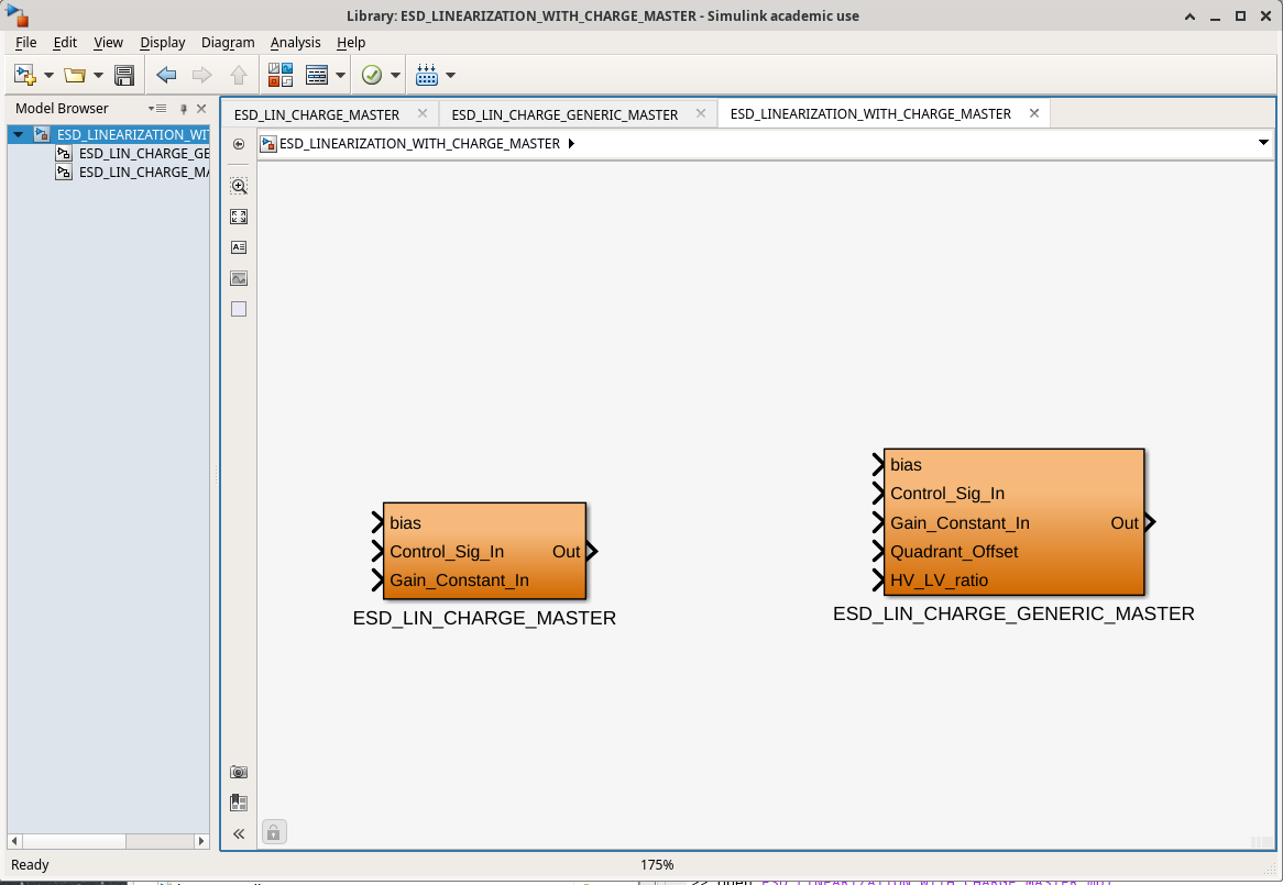 The ESD_LINEARIZATION_WITH_CHARGE_MASTER.mdl is *actually* a library, i.e. it contains a library of library parts that can be used for linearization.
