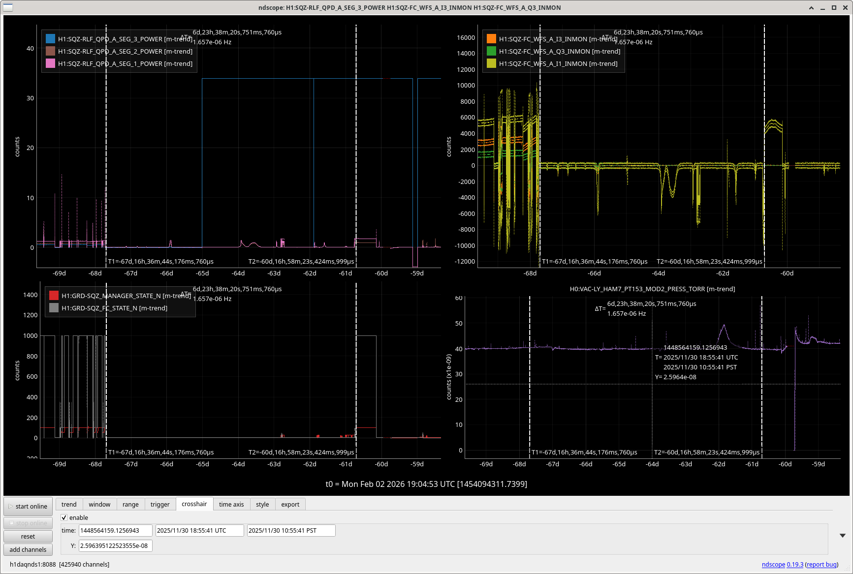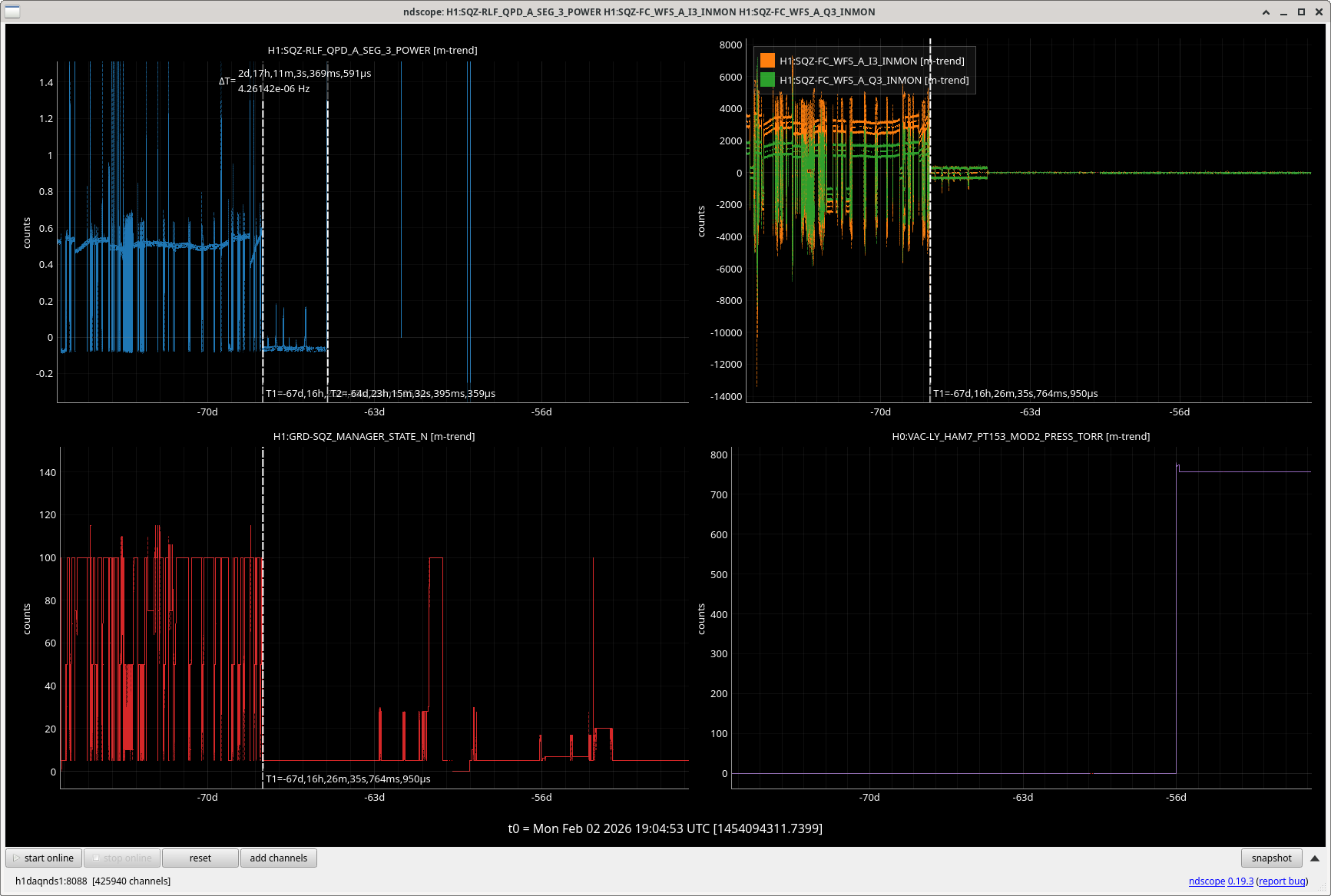 The attached plot show that the 105kHz channels from Q3 went quiet at the same time that the DC channel saturated, 10:40 pacific time Saturday Nov 29th. Then, on Dec 3/4th, the squeezer and filter cavity were relocked, and the signal on the 105kHz channels for the other quadrants returned but not on the Q3 signals.