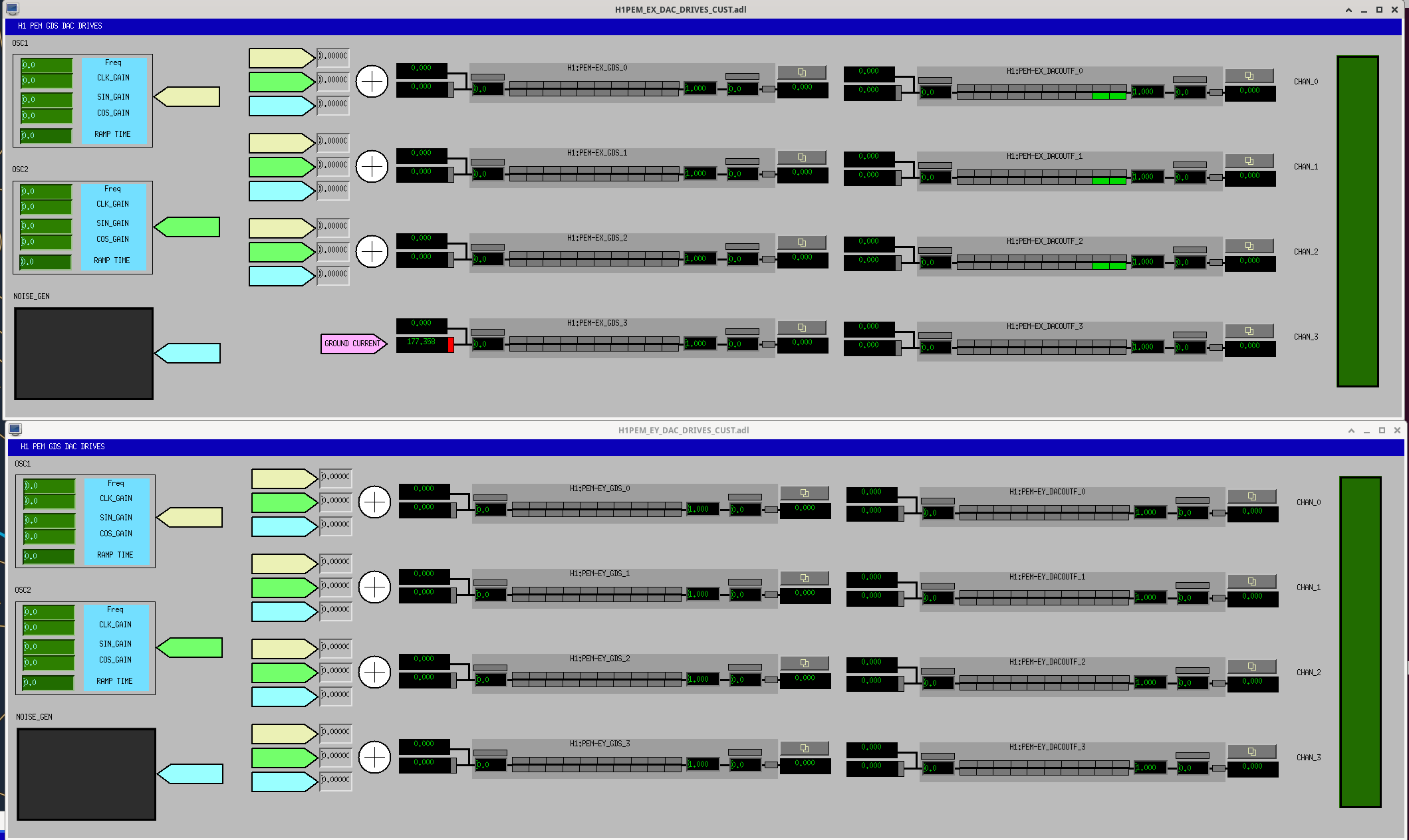 h1pemex was changed, the newly installed AMON subsystem which reads the current to ground signal now drives the 4th channel of the 20bit-DAC via the GDS_3/DACOUTF_3 filter module chain.