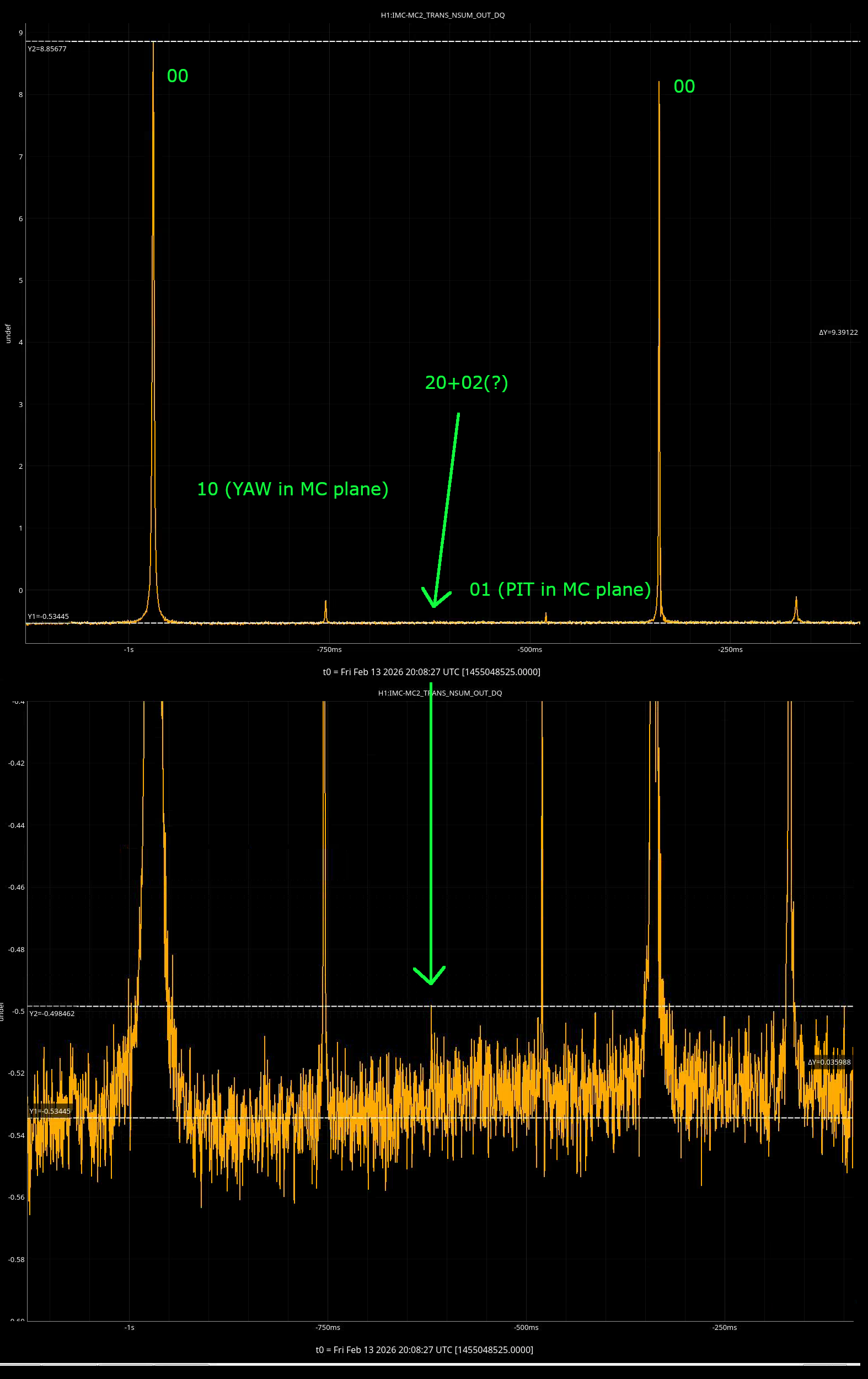 Good news is that the mode matching is still pretty good. Attached is the MC2 trans VS time while the PSL frequency was ramped. Assuming that the tiny thing pointed by the green arrow is actually 2nd order HOM peak, the mismatch is 0.036/9.4~0.4%. Consider this as an upper limit, because it's hard to tell if the "peak" is actually a peak, could be noise fluctuation.