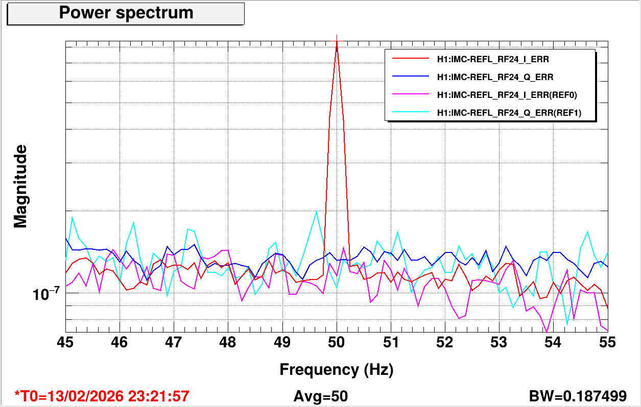 I only saw the line in I phase, so I tried taking a no injection reference and also bumping up the injection to 800 ct to see if there is signal in Q phase. There is no visible signal in Q phase. Therefore, I declare that the IMC refl demod phase is just fine at 20.87 deg.