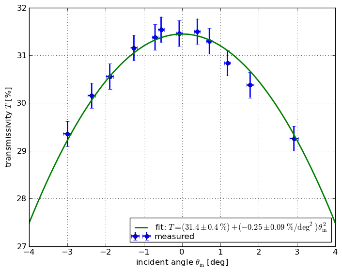 From the incident angle dependence measurement, the trasmissivity at 0 deg was estimated to be T=31.4 +/- 0.4(stat.) %.