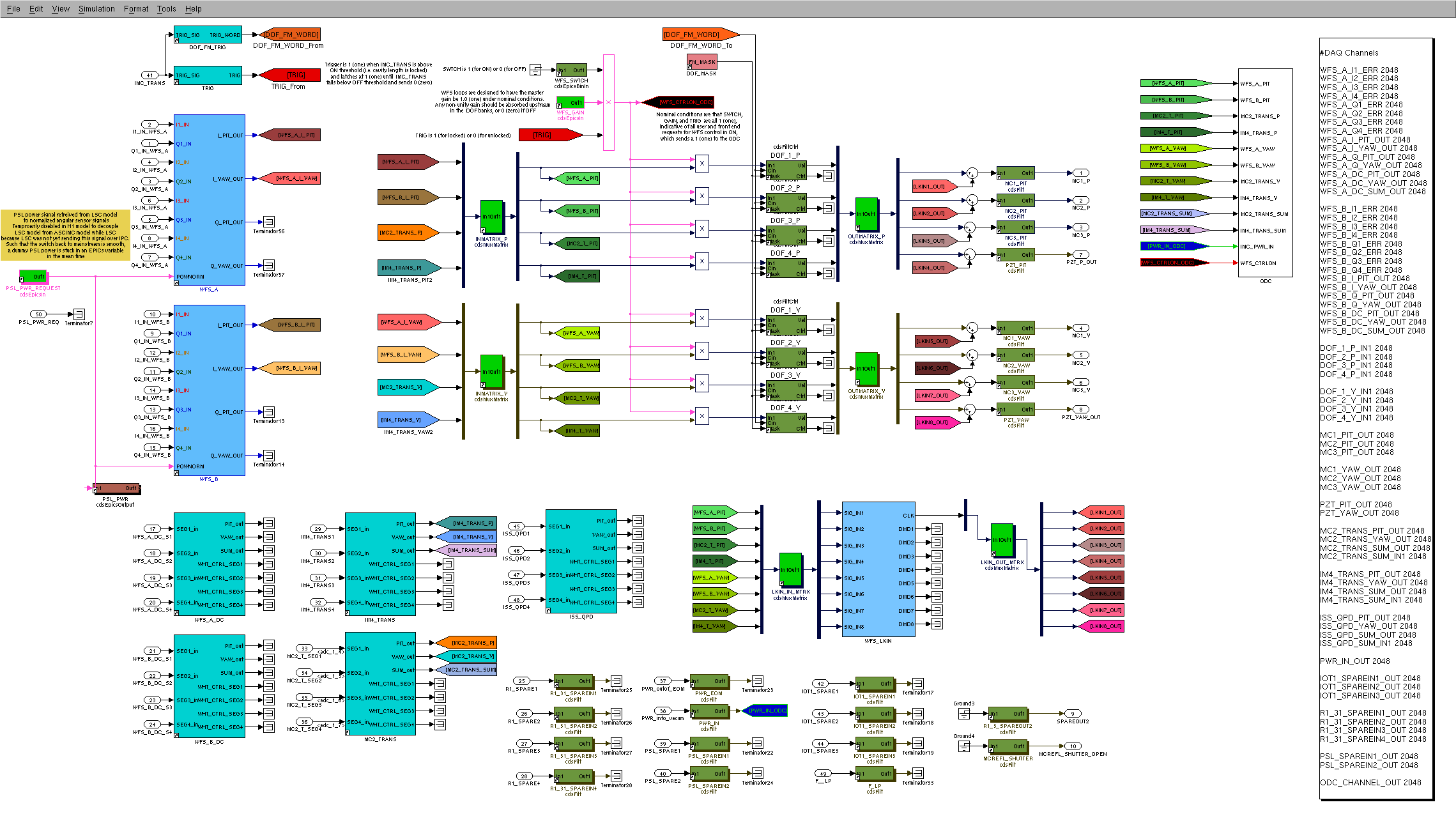 J. Kissel, S. Ballmer, C. Wipf After discussions with both Chris and Stefan, I have re-arranged how the IMC WFS' master switch, gain, and trigger bit are combined such that the implementation is a little less obfuscated and well-annotated in the Simulink model. I attach a new screenshot. In this new arrangement, each of the three variables -- all nominally 0 (zero) or 1 (one) for OFF and ON, respectively -- are simply multiplied together by one block, as opposed to feeding the trigger into a switch block that compares its value against the master switch (nominally 1 [one]) and a ground (equivalent 0 [zero]) [See identically named screenshot in LHO aLOG 7984 for previous implementation]. For historical purposes: Stefan had originally implemented the triggering with the comparator switch for philosophical reasons in that (at least with conventional c-code) it is bad practice to assume a trigger could only be 0 or 1 -- typically when programming in c, a flag is either zero or non-zero, where non-zero can be anything and should never be assumed to be one. However, the trigger library part used (from ${userapps}/release/isc/common/models/LSC_TRIGGER.mdl) is written to ONLY spit out a 0 or 1. Therefore this bad-practice failure-mode dos not apply, and we are free to make the output bit generation more clear. As of this entry, the ${userapps}/release/asc/h1/models/h1ascimc.mdl has been re-compiled, re-installed, re-started, and re-stored. Since the mode cleaner is dead for the time being due to venting of the corner volume (light from the PSL has been shuttered), I cannot *confirm* all is still functional, but I'm 99% confident all is well.