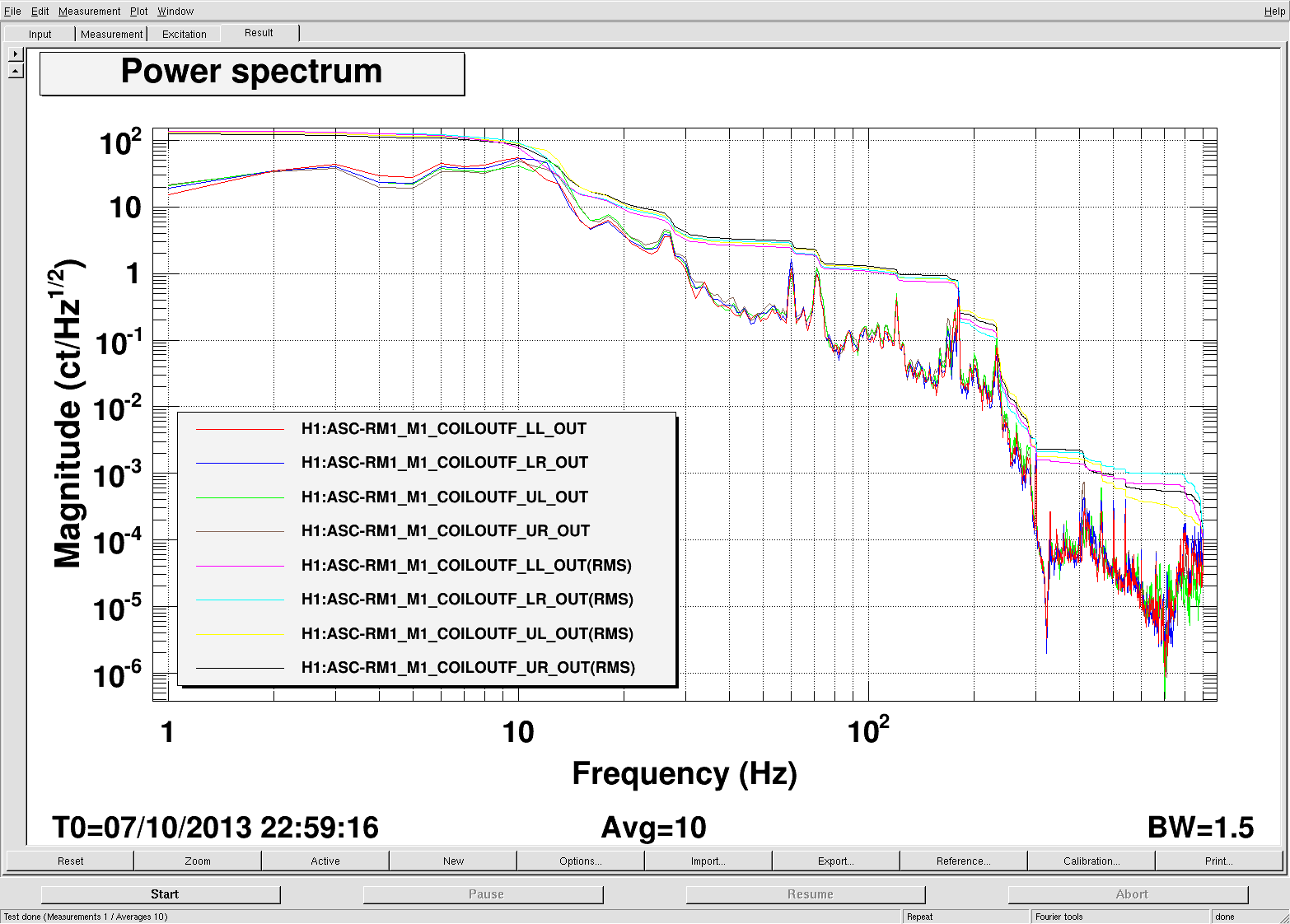 Currently RM1 and RM2 are still in acquire mode. Attached is a coil output signal plot in cts, with a calibration that mimics the the anti-dewhitening filter is applied. The RMS will still be <200cts, and that's with the purge air running. This will require putting jumpers in the RM1 and RM2 coil drivers (4 each). At the same time the OM1,OM2 and OM3 coild drivers can also be jumper-ed for RUN mode and to permanently enable them (2x4 jumpers per coil driver).