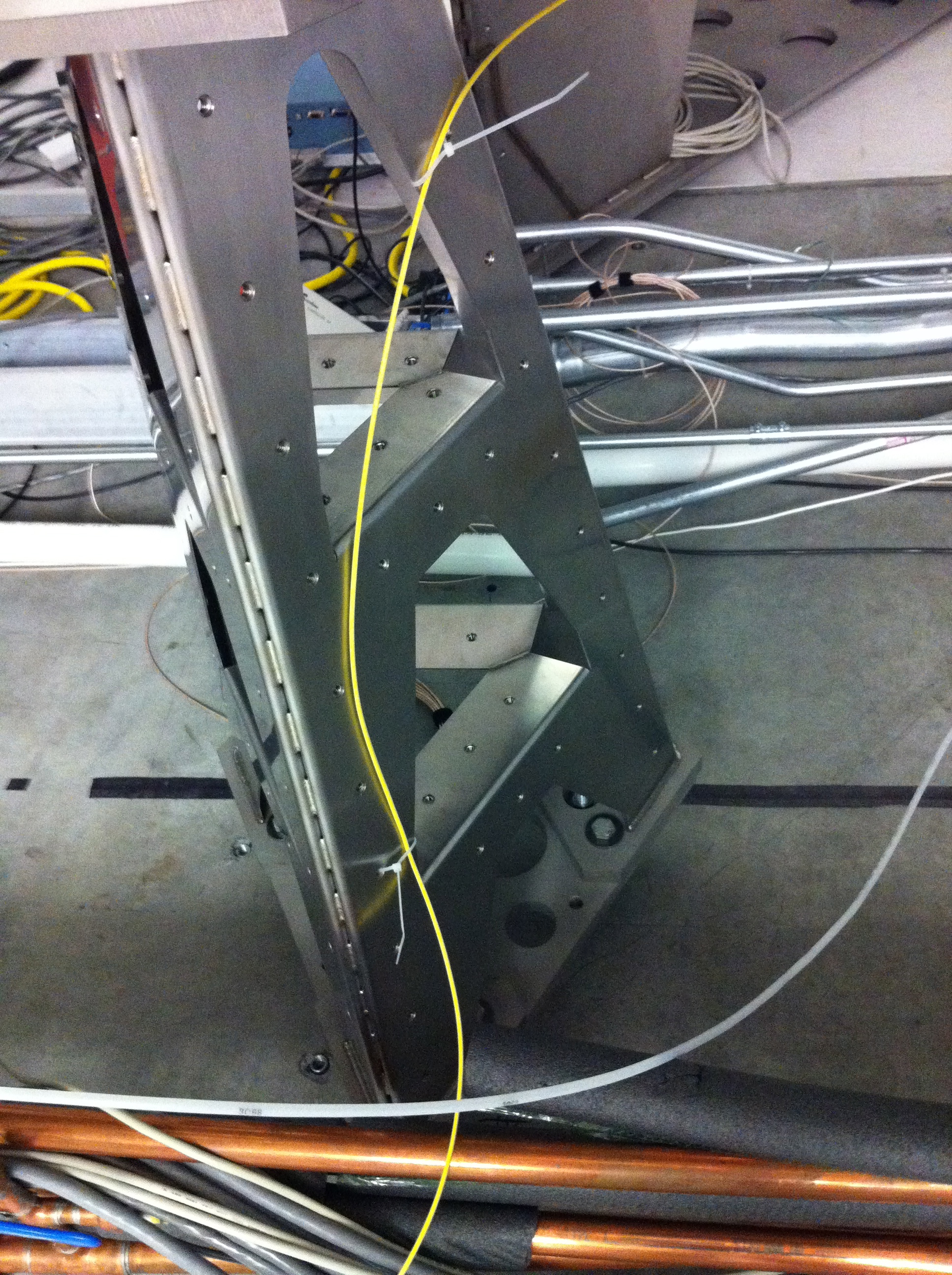 Emily, Tristan, Terra, Thomas ITMY optical lever has been showing lots of drift in yaw for the past few weeks (~ 1 urad/1 min), today we were able to close the gate valves and shutter the PSL so that we can open the transmitter and receiver units. At first we thought a few screws were loose and they were tightened, but that didn't help. Then we strain-relieved the fiber optic feeding into the transmitter but that also did not fix this drift problem. I found that the alignment was sensitive to me pushing on a nearby cable tray that was connected to a conduit that was leaning on a copper pipe that the optical fiber was laying on (picture attached). The optical fiber was being tugged on by the copper pipe as well as the conduit and cable tray so we isolated the fiber to decouple the connection. After the fix, the drift was much better, about +/- 1 urad for the course of a few hours, this will hopefully be a good set up to take spectra and long term testing. Also, we re-centered the PR3 and BS optical levers and will continue to recenter as needed for testing by SEI and SUS.