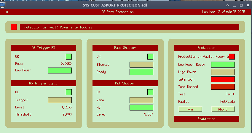 I wanted to go just to CHECK_AS_SHUTTERS to see if I could confirm that maybe the failure was just coincidental and based on a lockloss during the test, so I got up to CHECK_AS_SHUTTERS, and it did run the test by itself, but as it closed, it caused a lockloss(ndscope). After this test though, all of the issues on the AS_PORT_PROTECTION screen had cleared, so I went up again. I did accidentally leave the FAST_SHUTTER guardian in SHUTTER_FAILURE though(last time it got reset by my INITing), so that probably affected the next test that I tried on the next CHECK_AS_SHUTTERS. When we got there, it didn't run the test. I realilzed the FAST_SHUTTER guardian was in the wrong state and corrected it, but the test still didn't run, but the ISC_LOCK state marked itself as finished. I manually ran the test from the AS PORT PROTECTION screen, and it caused a lockloss. The test failed and the AS PORT PROTECTION screen is back to having lots of red, with the fault this time saying 'NotReopening'.