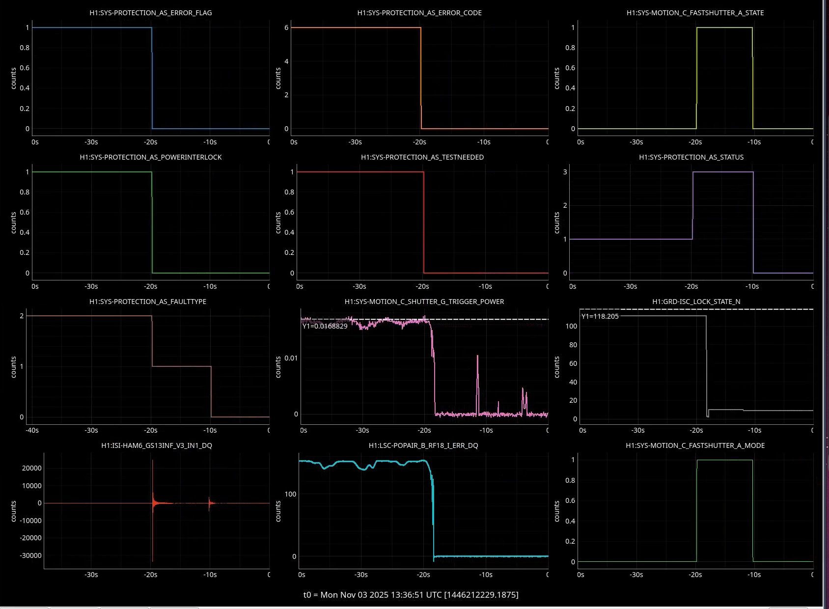 Got called by H1 Manager due to the fast shutter check during CHECK_AS_SHUTTERS failing. I've been looking at the trigger power and various SYS-PROTECTION channels (medm, ndscope), and it looks like to me that the fast shutter test failed only because we lost lock right as it was checking?? You can see the trigger power oscillating along with DRMI as DRMI is right about to fail. However, It does look like the fast shutter did not fire for this test.
