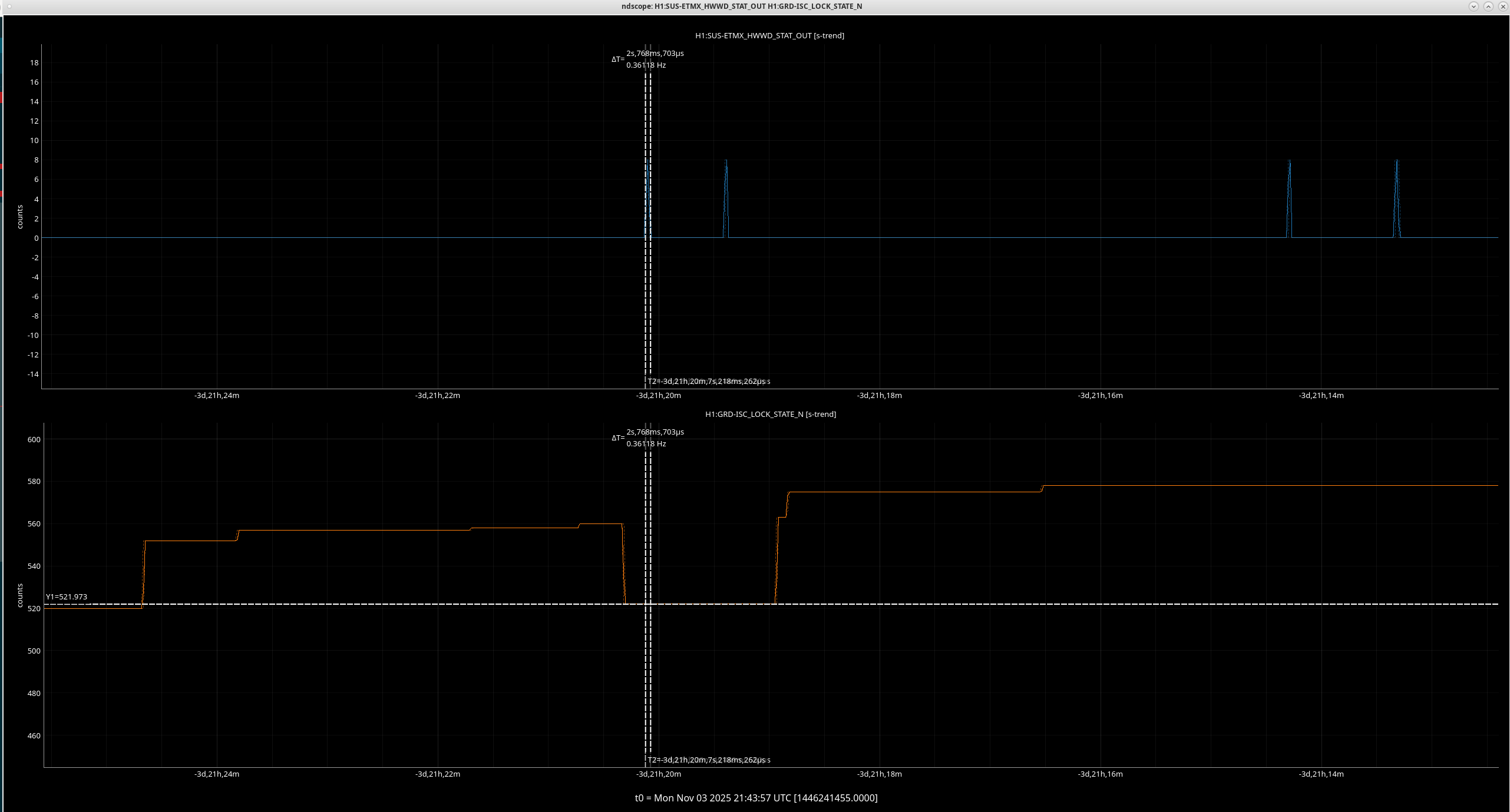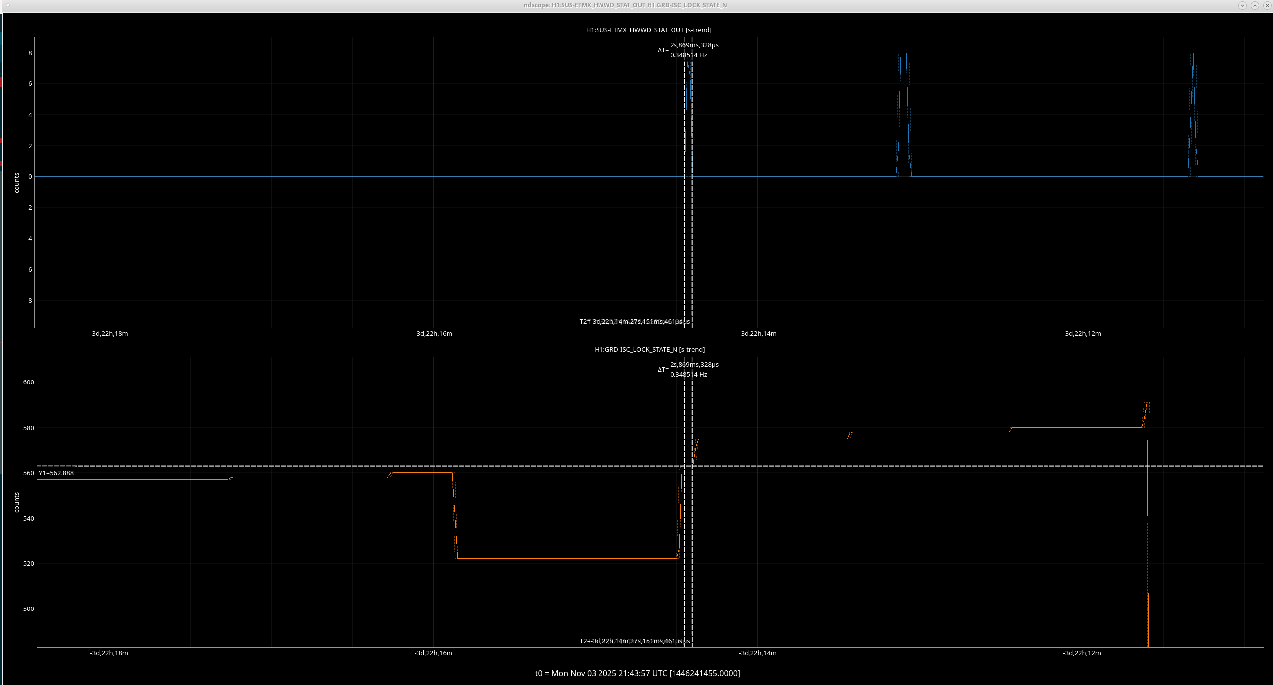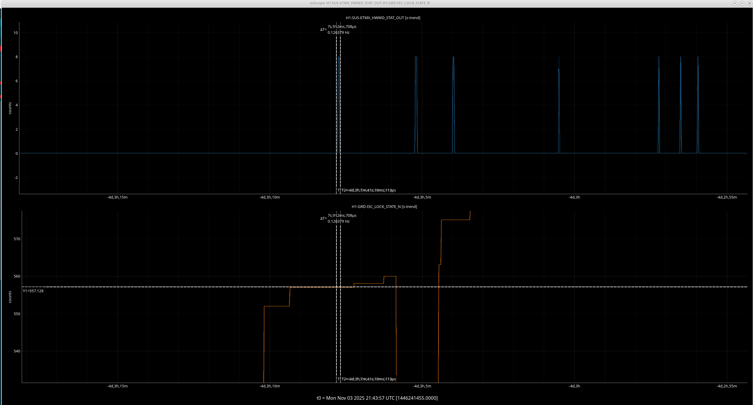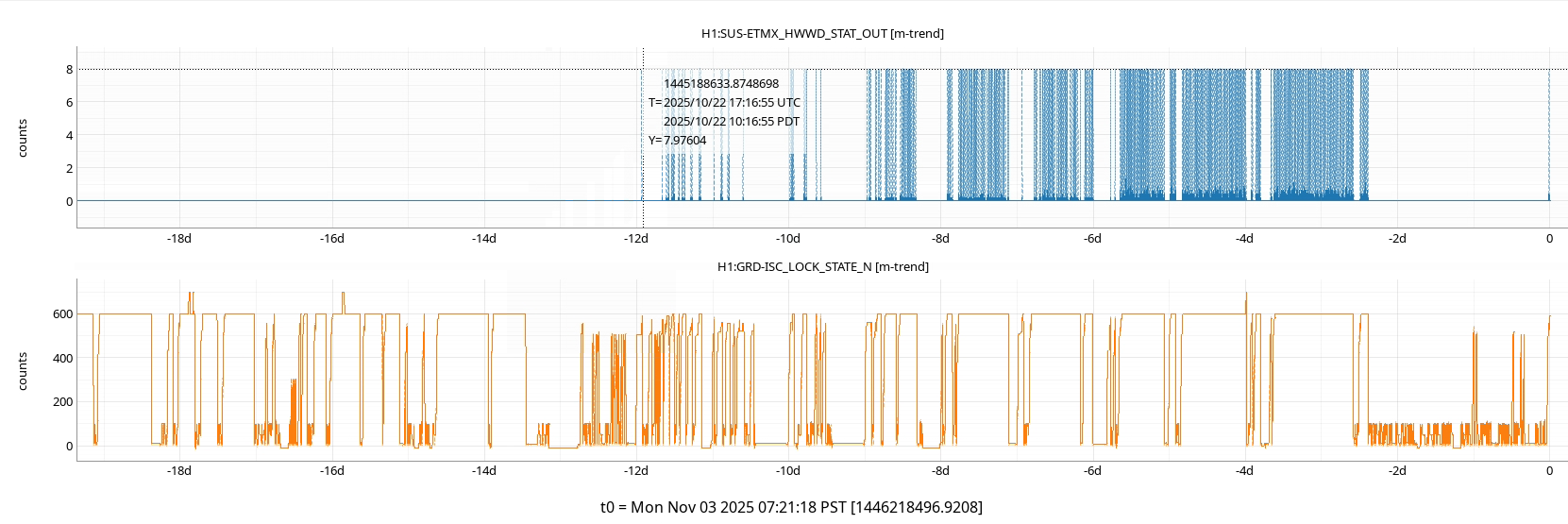 The ETMX Hardware Watchdog started showing activity again around Wed 20oct2025. This does not appear to be related to any maintenance or Satellite Amp work. As the plot shows, its activity is very closely correlated to the IFO lock state, this was not the case earlier this year before it went quiet.