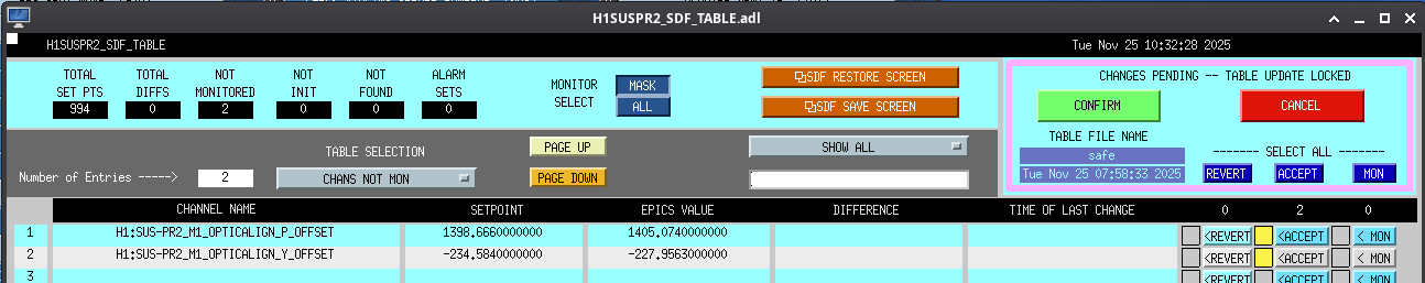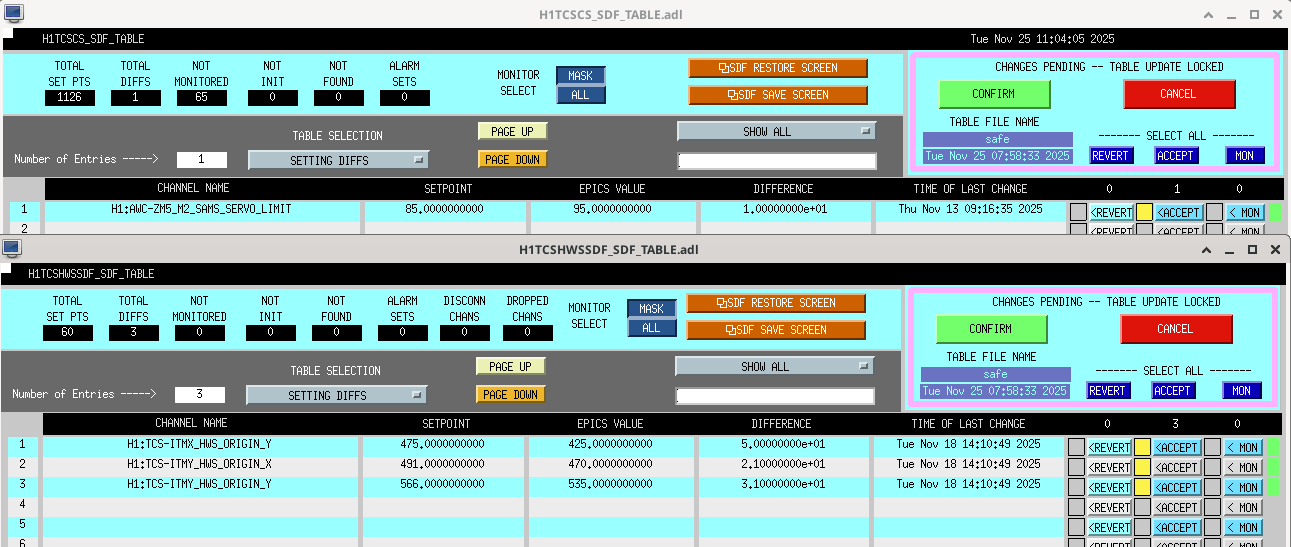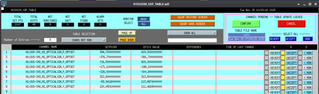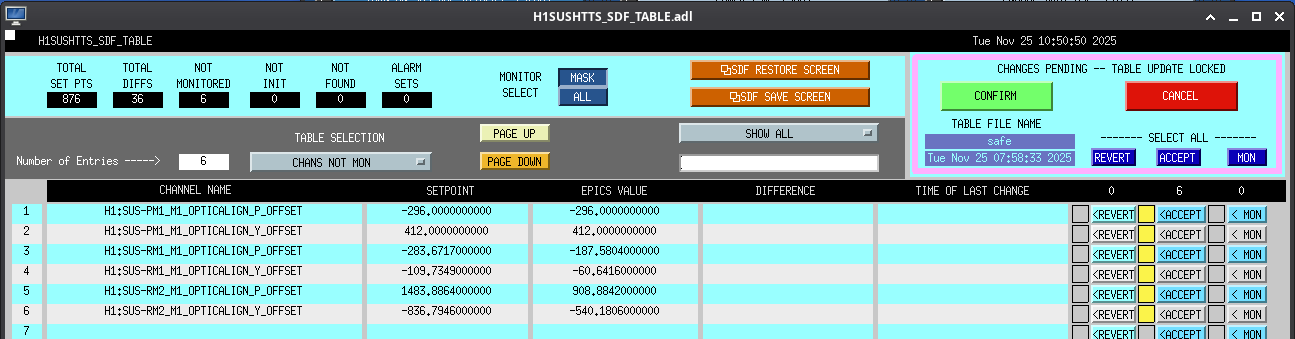 In prep for the upcoming CDS upgrades and vent Ryan, Jennie, and I went through the safe SDFs and accepted any values we thought needed it. We accepted all of the sus alignment sliders and checked on things like th IMC PZTs. The HWS had the center cross positions different, accepted. The ZM5 SAMS servo limit was also accepted.