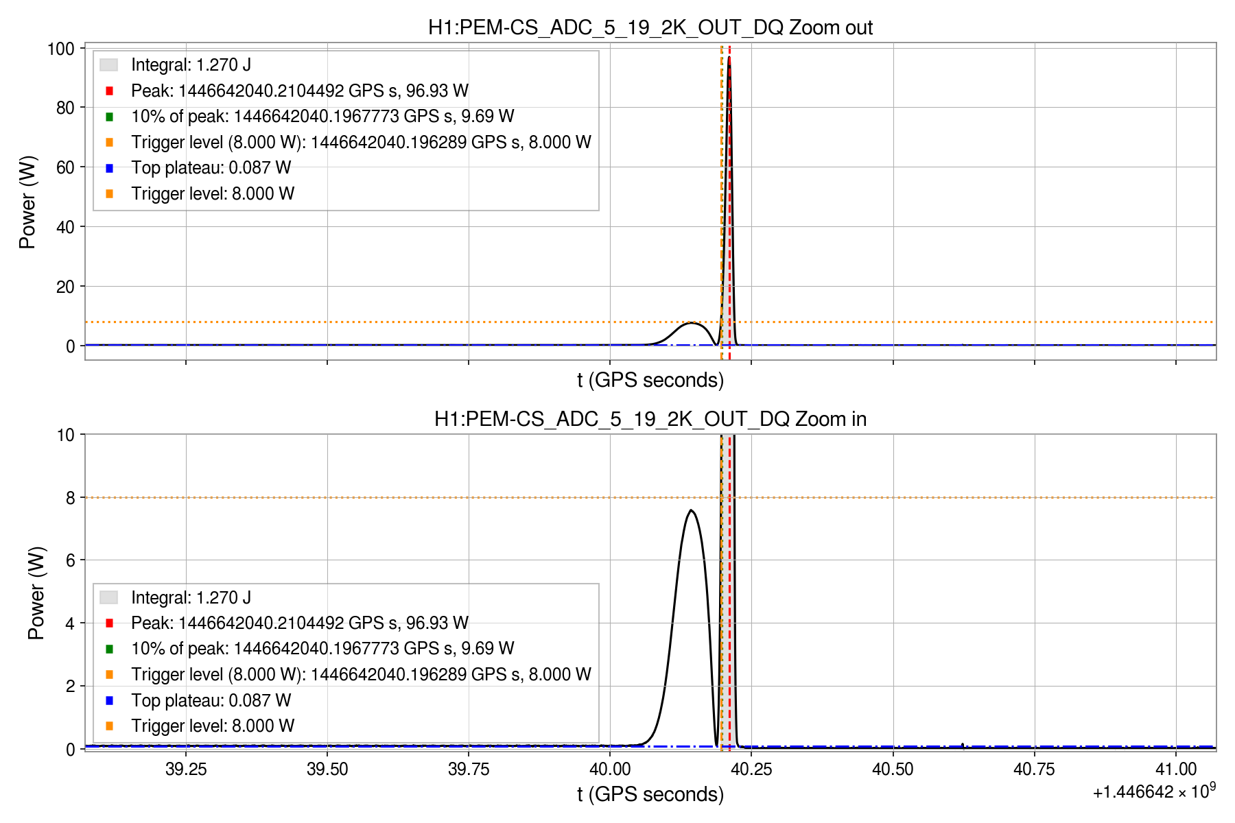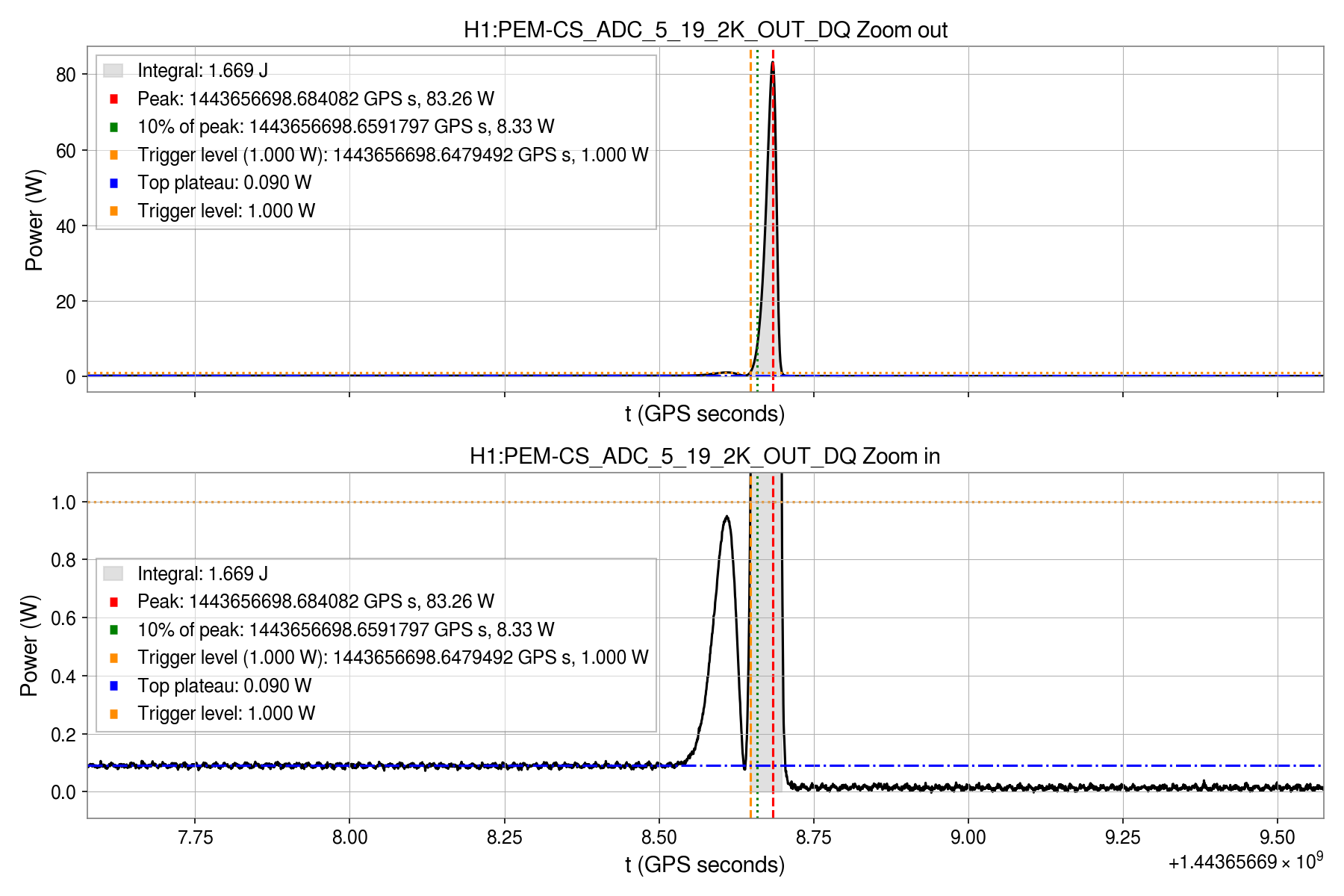For the present study the default calibration is CALIBRATION_W_PER_COUNT = 0.0177, corresponding to the beam diverter open configuration. All reported powers are in watts and all integrated quantities are in joules. If one wants to compare directly with the energies quoted in aLOG 81130, the same script can be re-run with CALIBRATION_W_PER_COUNT = 0.177, in which case all energies scale up by a factor 10. Definition of peak, trigger level and 10-percent point