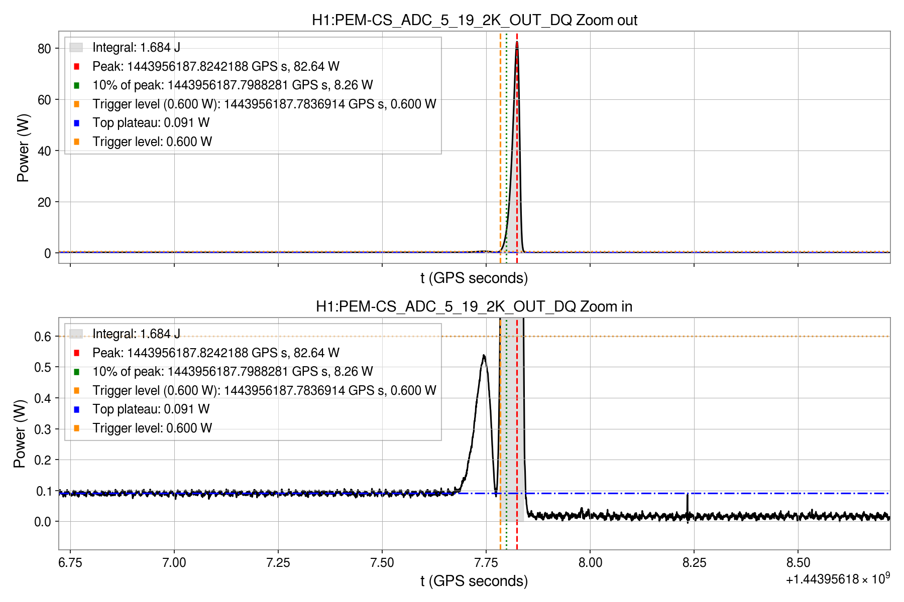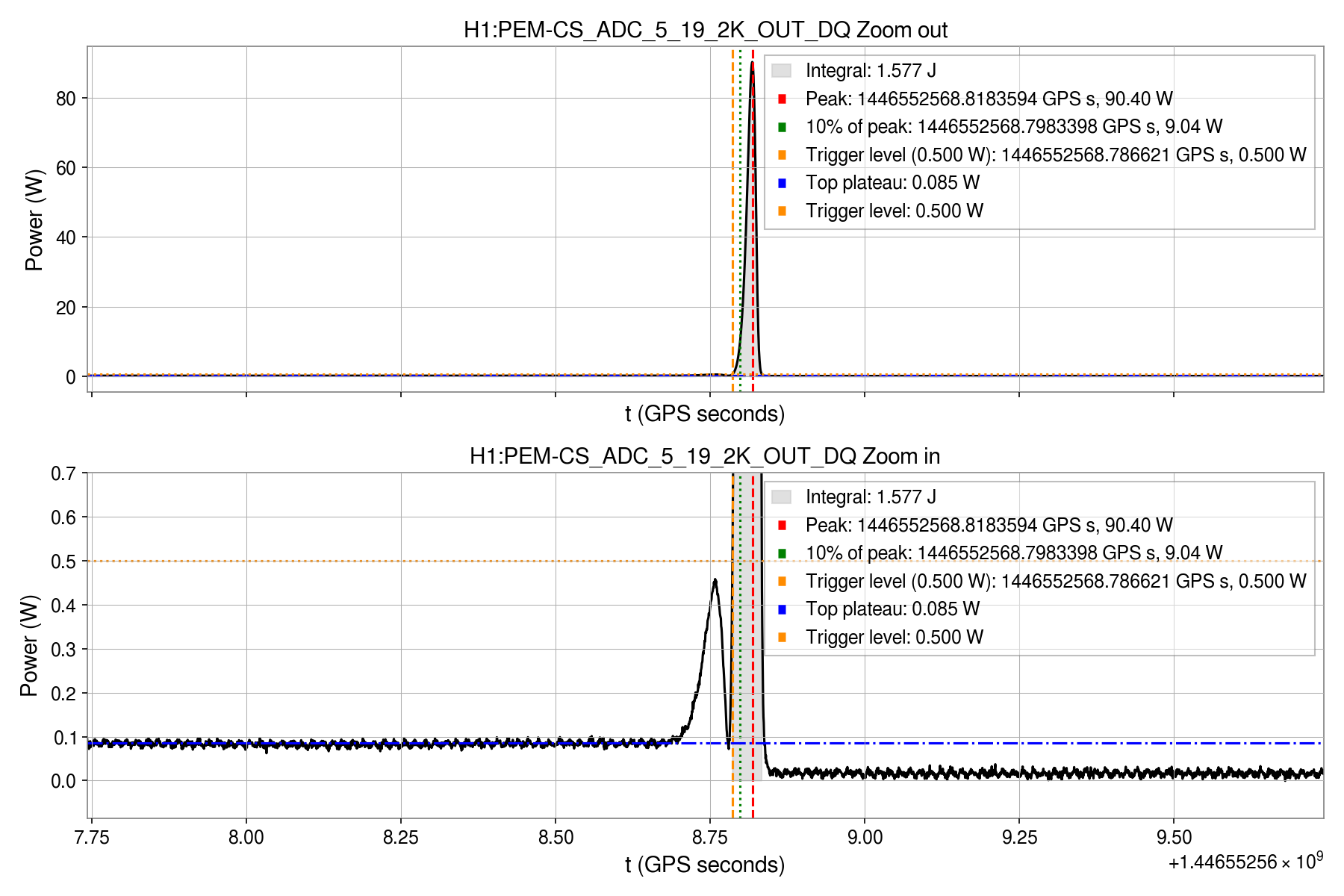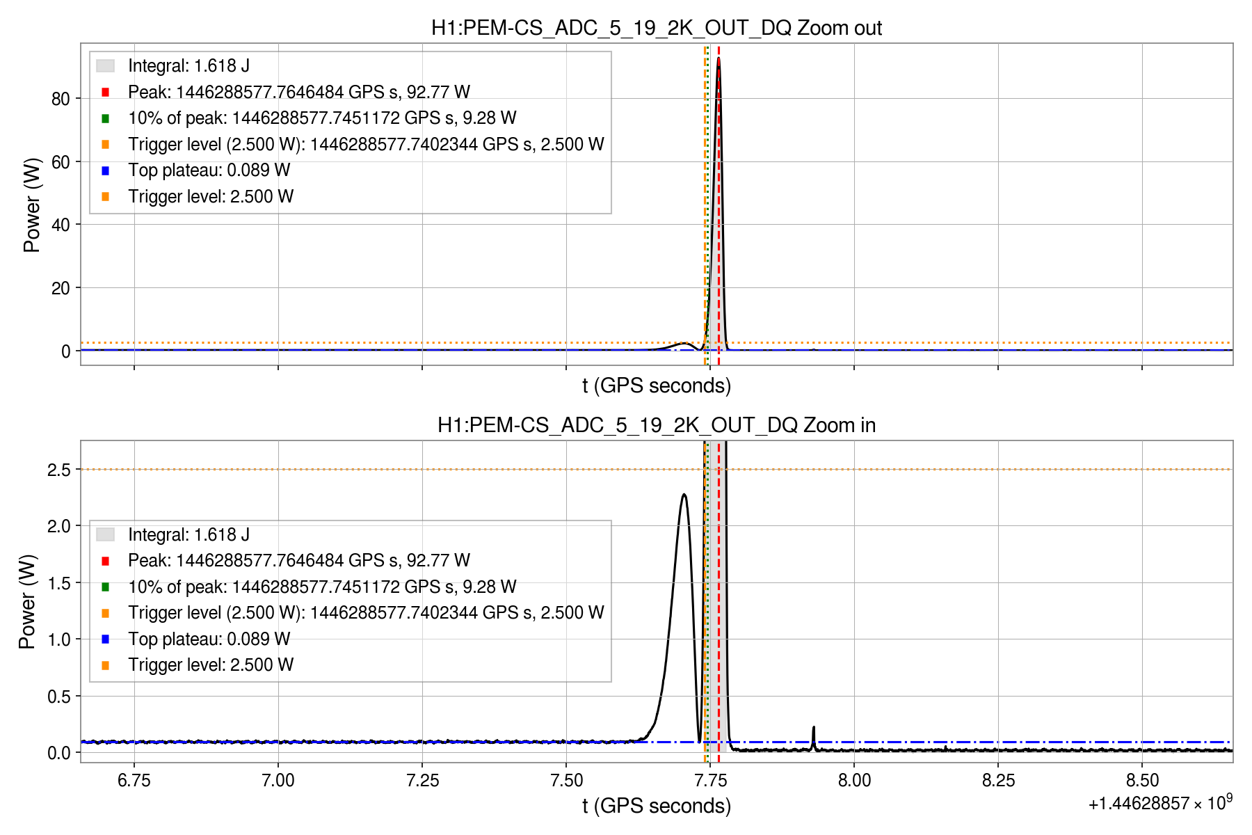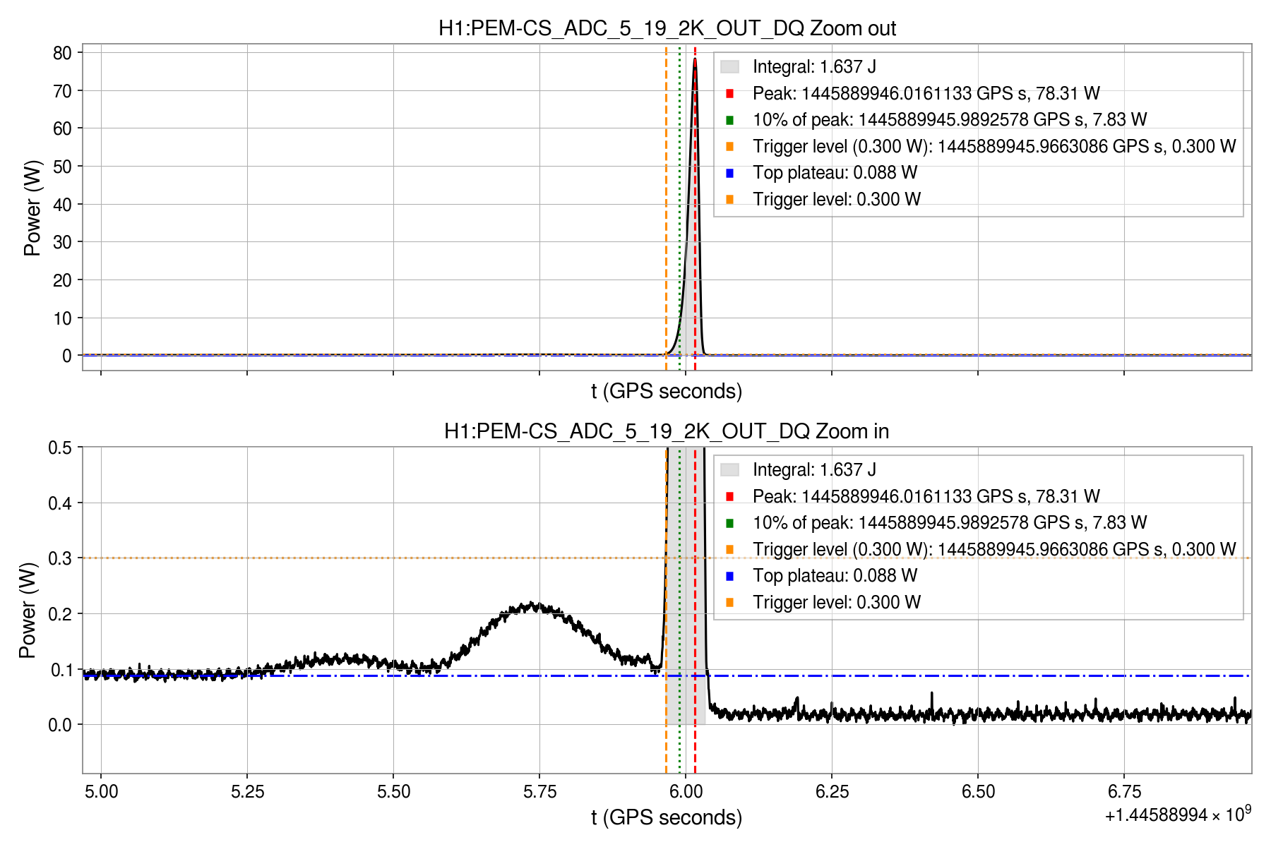 The first figure below shows a representative event analysed with the nominal trigger level of 0.2 W. In the legend one can read the peak time and peak power, the time and value of the 10-percent-of-peak crossing, the trigger-time crossing at 0.2 W, the plateau power, and the integrated energy of the pulse. The zoomed panel highlights the plateau, the rapid rise into the main burst, and the decay back towards zero:
