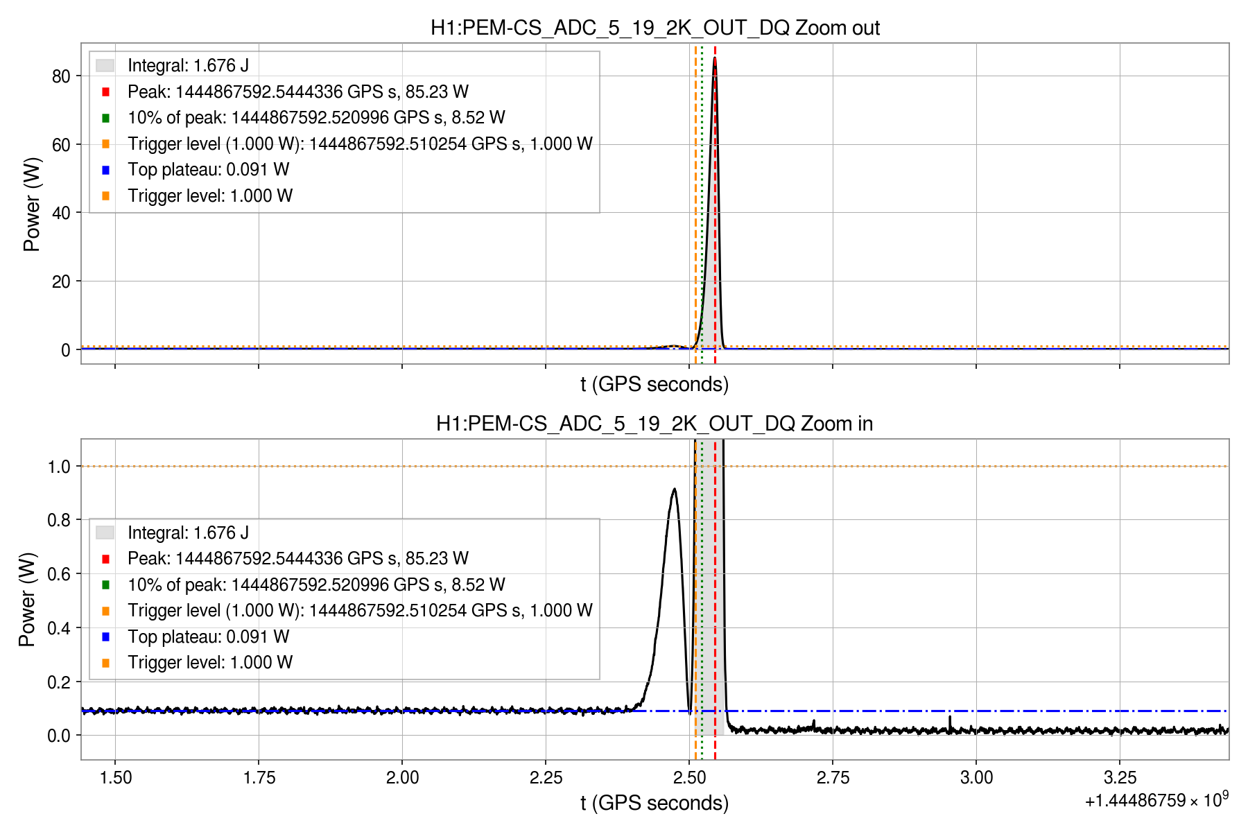 - The peak power at HAM6, defined as the maximum of the calibrated power time series P(t) in the analysis window (peak_value_W, at time peak_time_gps).