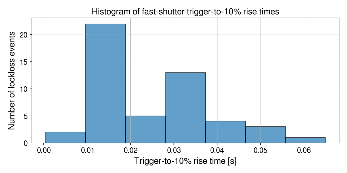 These and related reports motivate a more systematic study of the timing of the fast shutter response during lock losses, in particular the trigger-to-10-percent rise time inferred from the HAM6 PEM channel. As a secondary quantity, we also keep track of the energy deposited in HAM6 to flag potentially dangerous high-energy pulses. Data and calibration