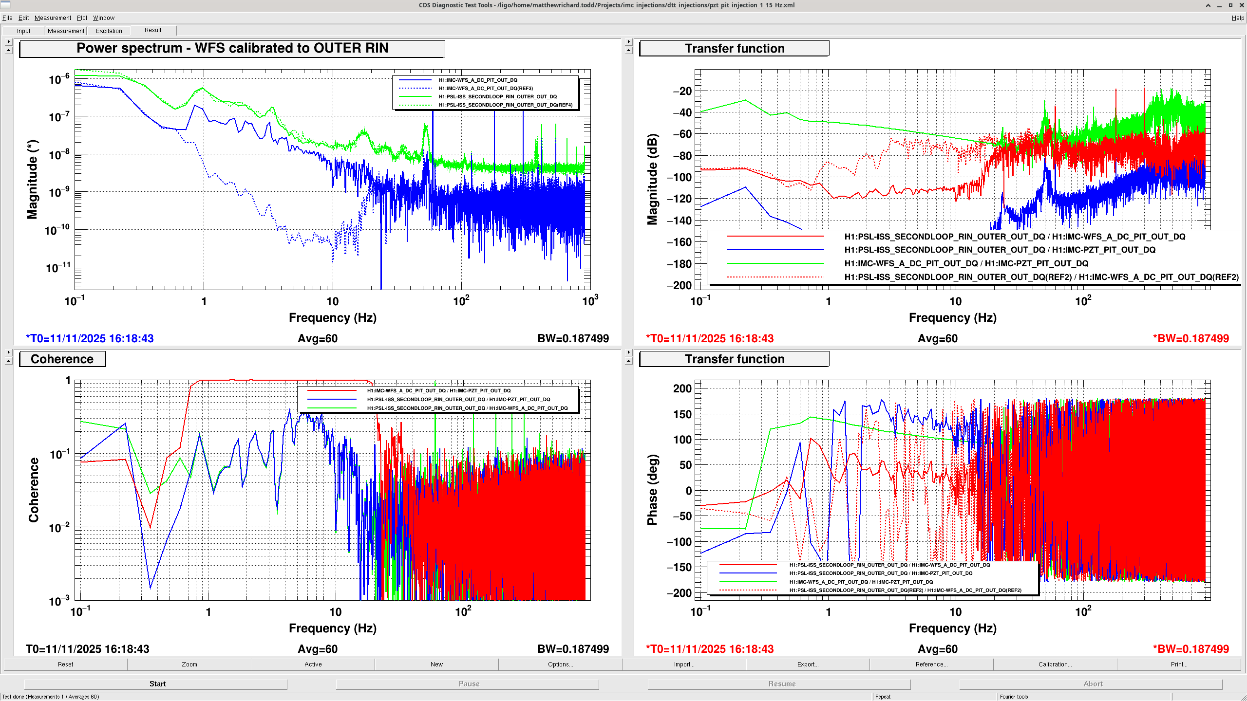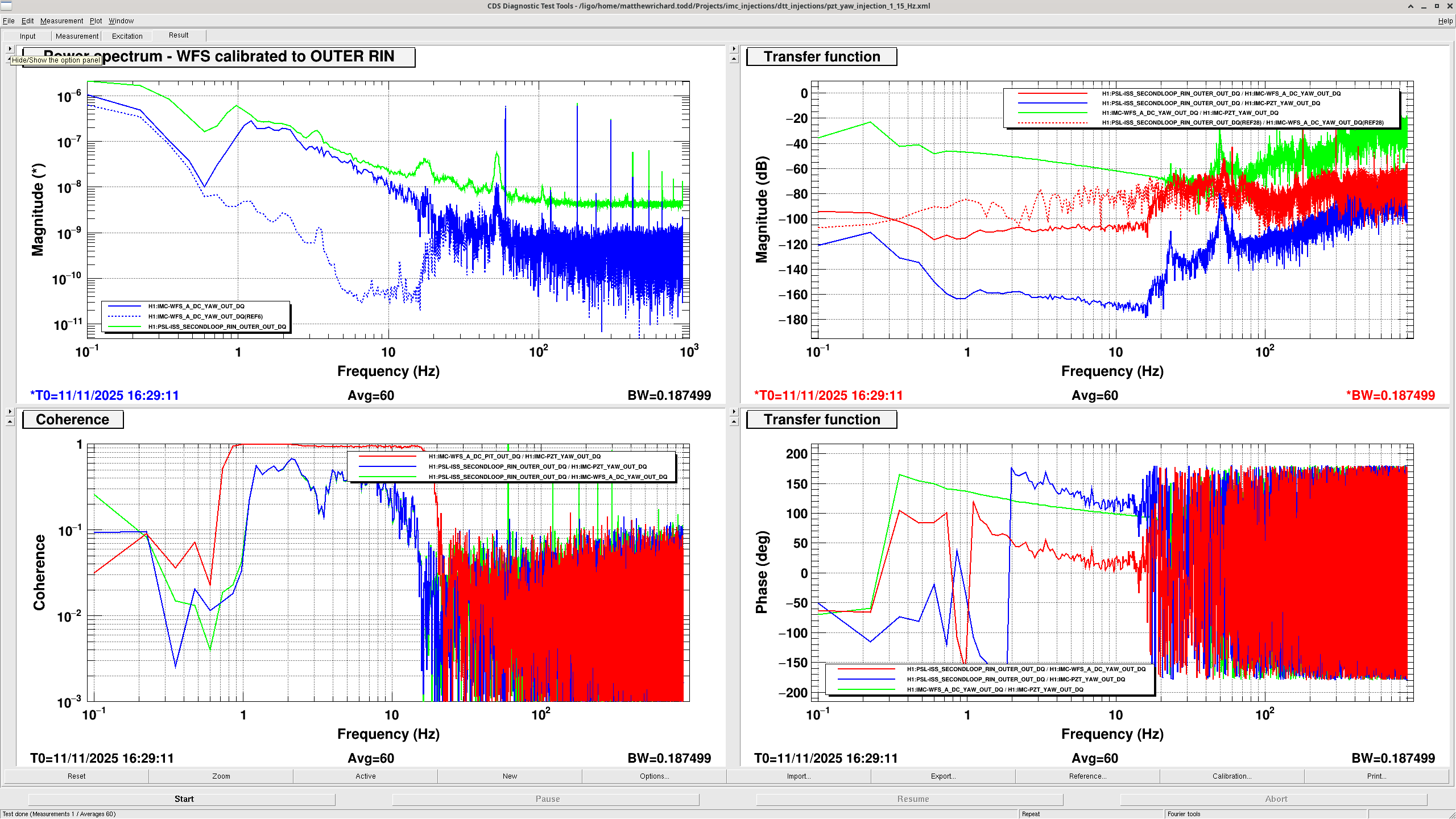 | PZT YAW -> ISS OUTER RIN [1-15 Hz] | 1446913769 | /ligo/home/matthewrichard.todd/Projects/imc_injections/dtt_injections/pzt_yaw_injection_1_15_Hz.xml | Dotted line is quiet time projection to ISS RIN |