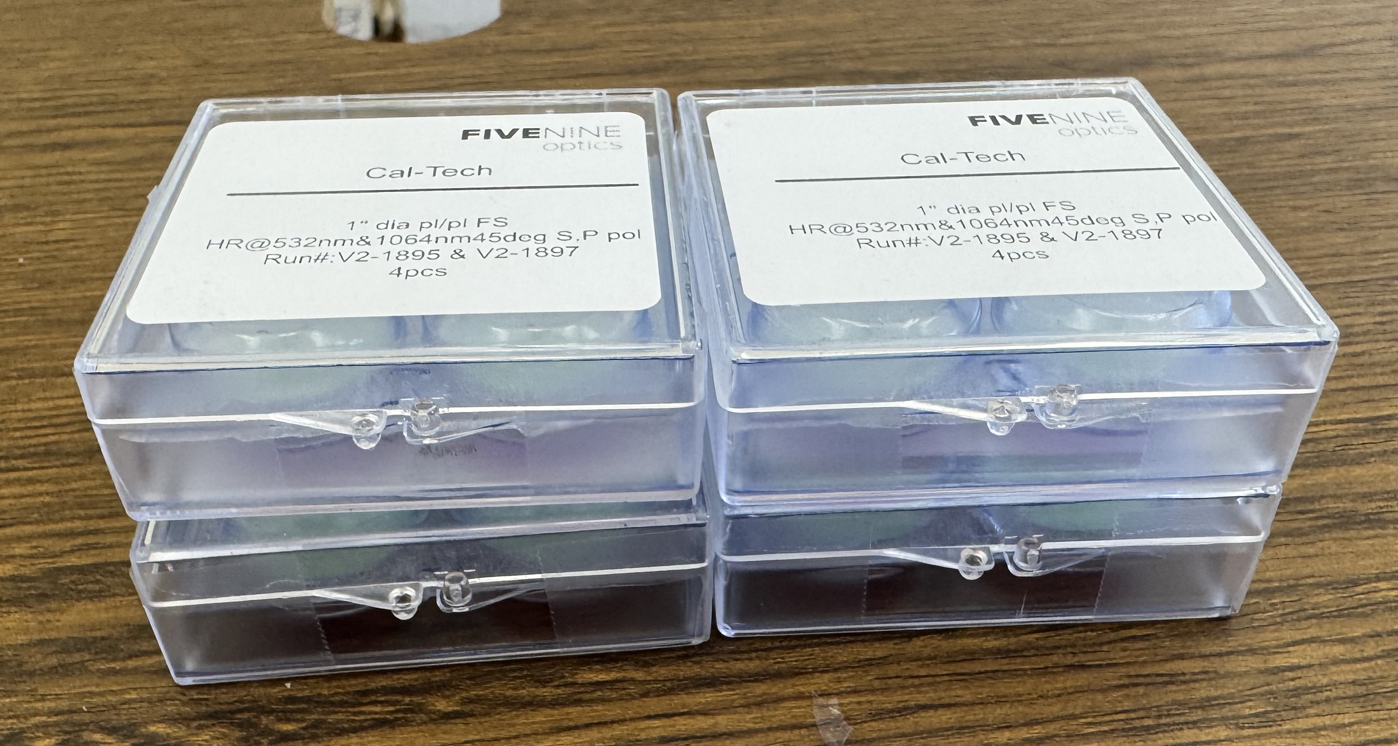 J. Kissel, C. Gray, M. Nakano, G. Billingsley We're getting started with cleaning our 1" and 2" optics for SPI. Corey uploaded *all* of our optics (50:50 BSs, 85:15 BSs, TFPs, HR mirrors, Lenses etc.) to ICS in prep, and I reviewed the work double checking that the ICS record information makes sense. For the HR mirrors, which were part of the 2025 large custom purchase order (C2500044) from FiveNine Optics (to be used by JAC, SQZ, the LLO TNT Lab, and SPI), he entered them into ICS with a key that used the DCC number that's physically etched into the barrel of the optic. HOWEVER -- the DCC number etched on the barrel of the optic is E1900393 -- E1900393. See attached picture. That drawing number is for the coating spec of 0-25 deg AOI HR mirrors. The physical coating spec we want, was provided, and bought was for 45 deg AOI, i.e. E1900392 -- E1900392 (one DCC number lower). So these HR optics, coated with E1900392 spec, bought with C2500044, which have vendor run numbers 1895 and 1897, have the incorrect DCC number for the spec etched on the barrel. If you head to the purchase order, C2500044, and look at the FNO_4787-1.pdf attachment, it clearly states (twice!) "[...] per drawing E1900392-V2. Serialization per E1900392-V2." However, if you then *read* E1900392-v2, section 8 states equally clearly "Each optic should be serialized and marked with the following code/description: 1" optics: E1900393-v2-01 S/N:01 HR1064+532 with incremental S/N: 01, 02, 03, ... 2" optics: E1900393-v2-02 S/N:01 HR1064+532 with incremental S/N: 01, 02, 03, ..." Thankfully we know the coating is the correct E1900392 coating -- (1) The PCAL team confirms via measurement at 45 deg AOI, that these have transmission at the level of ~5e-5 W/W, so these will serve excellently as HR mirrors at 45 deg AOI. See LHO:86699 (2) The vendor's data, posted to C2500186, (Even though the run numbers listed on the first page of the data for the First Batch are quoted as "V2-2895" and "V2-1897" we know the run numbers are V2-1895 and 1897 from what's written on the containers the optics came in; see attached picture) show figures with captions indicating the data is from AoIs of 38, 45, and 50 deg, a reasonable range of AoI's to test for a 45 deg AoI mirror; and conversely no measurement of anything at AoIs less than 25 deg, which would be what one would report for a coating that's spec'd with the *actual* E1900393 spec. (3) The E1900392 spec specificies a 45 deg AoI. So, now we just have to figure out how to keep track of this information when we're in the lab / in the chamber, 5 years later, and the optics are no where near their cases and a brand new person is using the optics. C'est le vie!