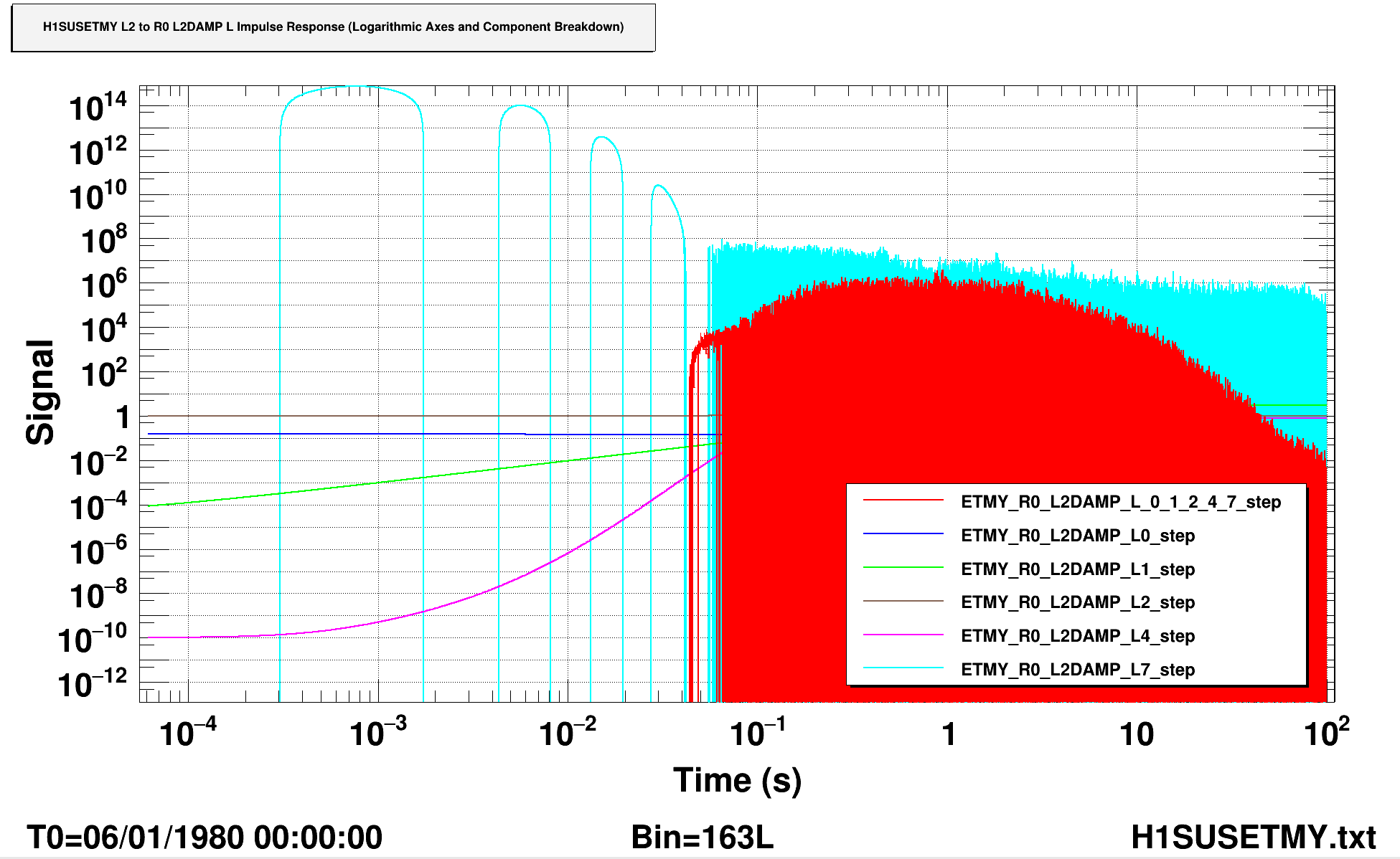 Plotting the impulse response of the SUS-ETMY_L2_R0DAMP_L filter bank, we see that these filters have an impulse response time of ~16 seconds, and breaking down the impulse response by each filter's contribution, we see that the FM8 (module 7) filter module, invPsmoo, has a wild impulse response. Because of this filter module, the impulse response of the entire R0_L2DAMP_L filter bank is extremely long, and the signal is very large. The frequency response plot for module 7 shows us that it approaches the 10^15 gain at higher frequencies. Additionally, these new satamps have about double the gain at high frequencies as compared to the old satamps, so that would also be exacerbating any issues at higher frequencies.