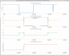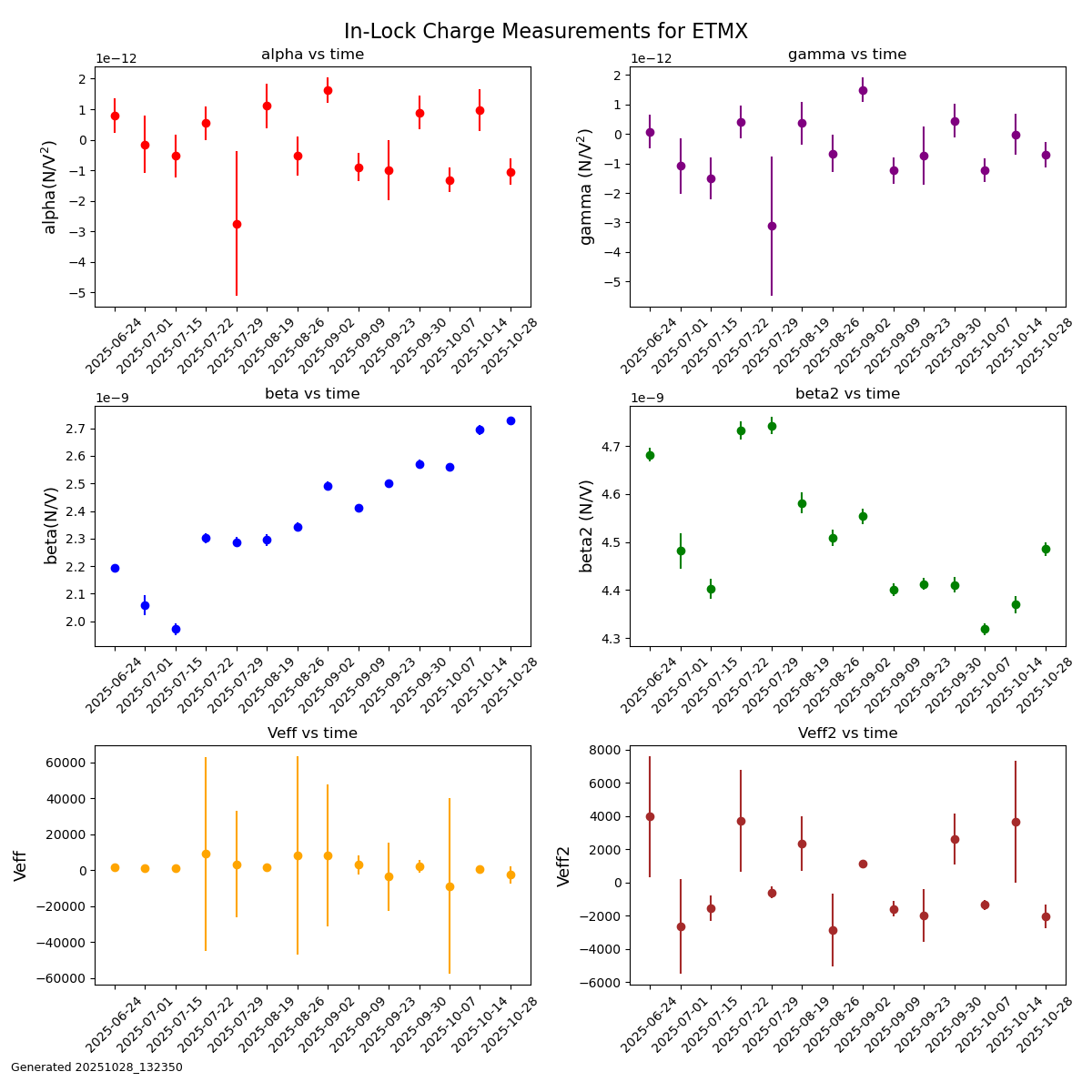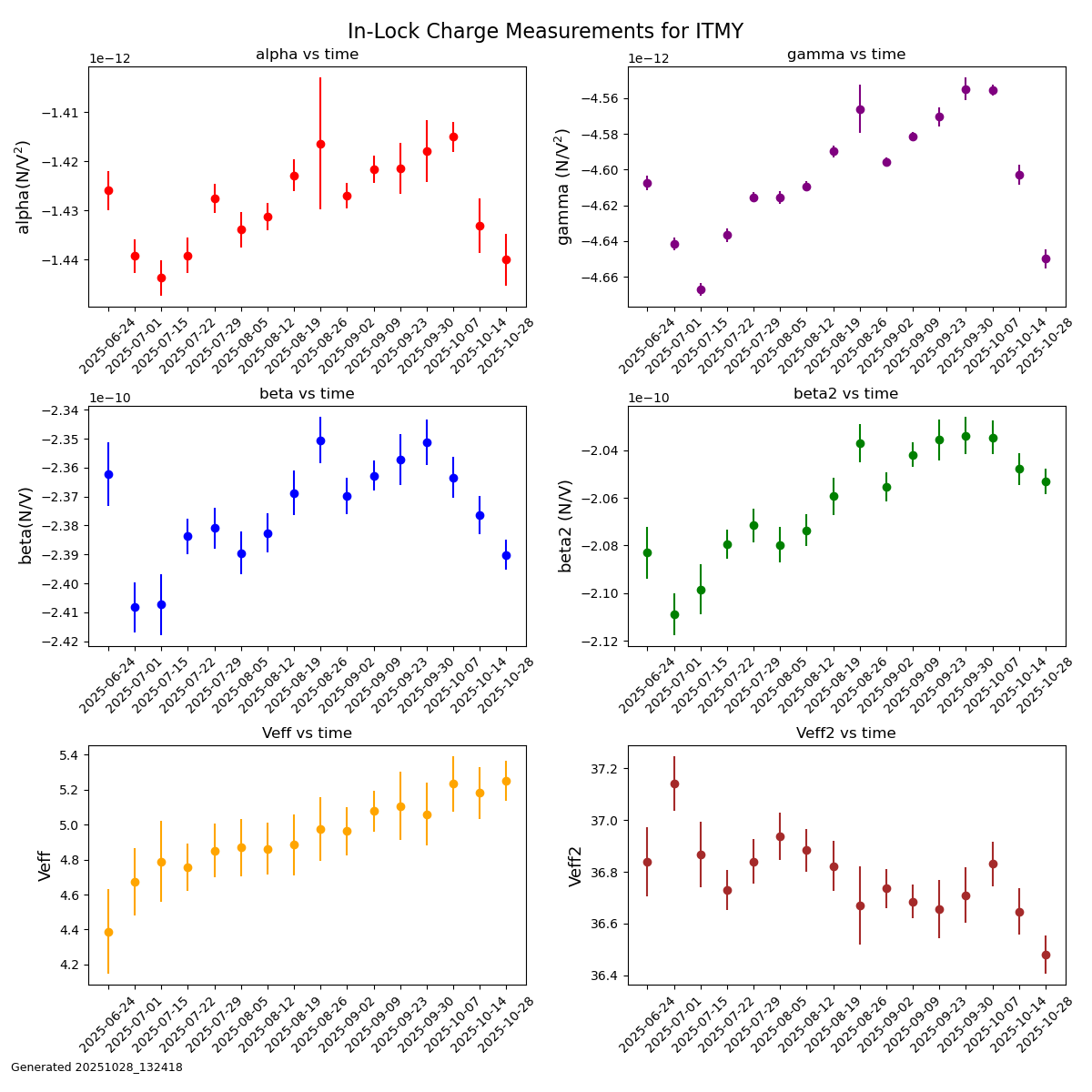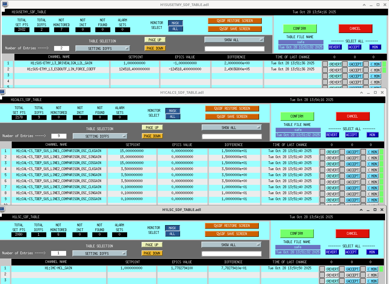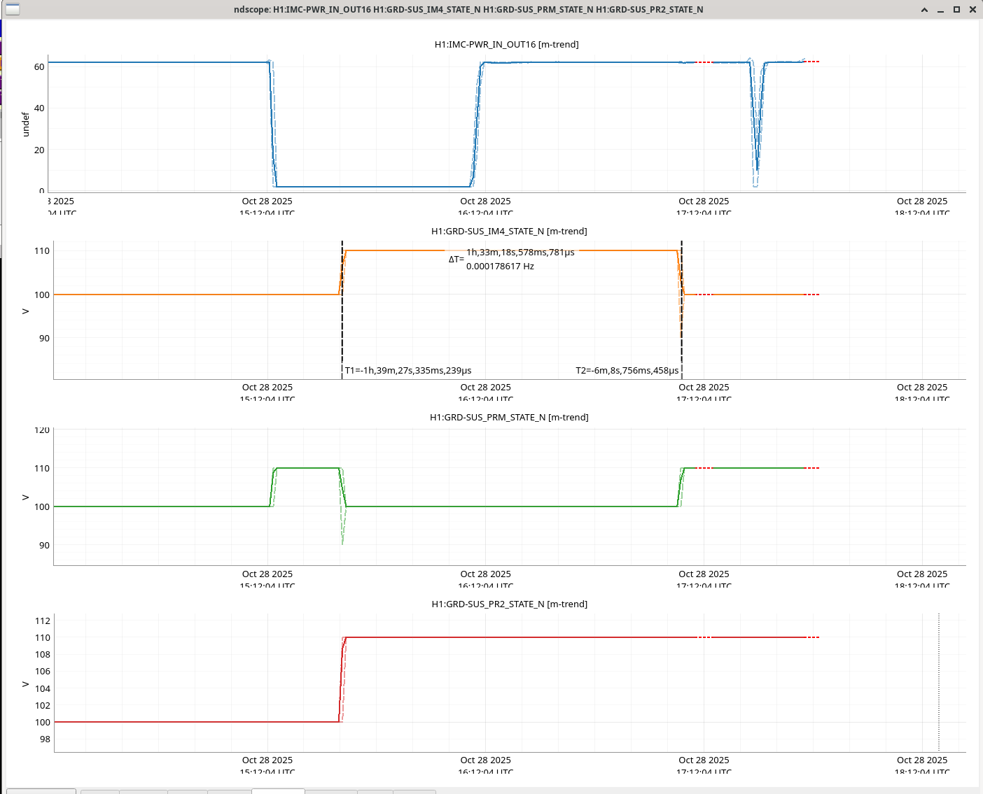 J. Kissel, M. Todd, S. Dwyer Just recording this for posterity in case: Matt and I wanted to (continue) parallelizing our work on characterizing the ISS Array at full / nominal power (60W into the PSL) and characterizing RPM dynamics for future HSTS Estimator modeling, respectively. The estimator team discovered a week or two ago that PRM has a different dynamical response when the SUS is ALIGNED vs. MISALIGNED. So, I misaligned IM4 and PR2 to ensure the 60W didn't go anywhere but a fixed location, and aligned PRM. The worry is that IM4 doesn't have a "safe" designated fixed location to dump its reflected beam when misaligned -- there's no "parking dump" like there is for PRM. So -- this an aLOG to indicate the times of high power with IM4 misaligned and what little info we have about the physical position. I say "what little information about the position we have" because IM4, which is a HAUX suspension -- while IM4 has recently had its OSEM sensor PD sat amp upgraded, we have not measured or installed an absolute calibration for the sensors with an ISI injection. We know from other suspensions, that OSEM PDs can have factors of 2x to 3x errors between the "generic calibration based on electronics and [likely ancient] open light current measurement" and the modern absolute calibration from the ISI GS13s. There *is* a calibration of the IM4 alignment sliders -- installed in Apr 2024 (LHO:77211). However, that calibration was based on the OSEM sensor PDs. So we have to take the fidelity of this calibration with a huge grain of salt a la the above distrust in OSEM PD calibration. So -- IM4 had the following alignment offsets requested of its sliders: OFFSET OUT16 ["urad"] [EB-DAC ct] P +114.539 +1248.53 Y +111.103 +625.387 and its *misalignment* offsets -- which are not calibrated in the front-end, but I've calibrated them using the (P,Y) = (10.9005 , 5.6289) [EB-DAC ct / "urad"] calibration from LHO:77211 here: OFFSET OUT16 ["urad"] [EB-DAC ct] P +50.915 +555.0 Y +98.598 +555.0 So, misaligned, that give a total requested displacement of OFFSET OUT16 ["urad"] [EB-DAC ct] P 165.454 1803.532 Y 209.701 1180.388 IM4 was misaligned, with PRM aligned and PR2 misaligned, and 60W into the IMC from 2025-10-28 16:08 UTC to 2025-10-28 17:06 UTC. After 17:06 UTC, the IMC power remained at 60W, but I aligned IM4 and PR2 and misaligned PRM. (The normal "IFO DOWN" configuration). (So yes, we didn't turn the IMC power down before we went from misaligned to aligned, either.)