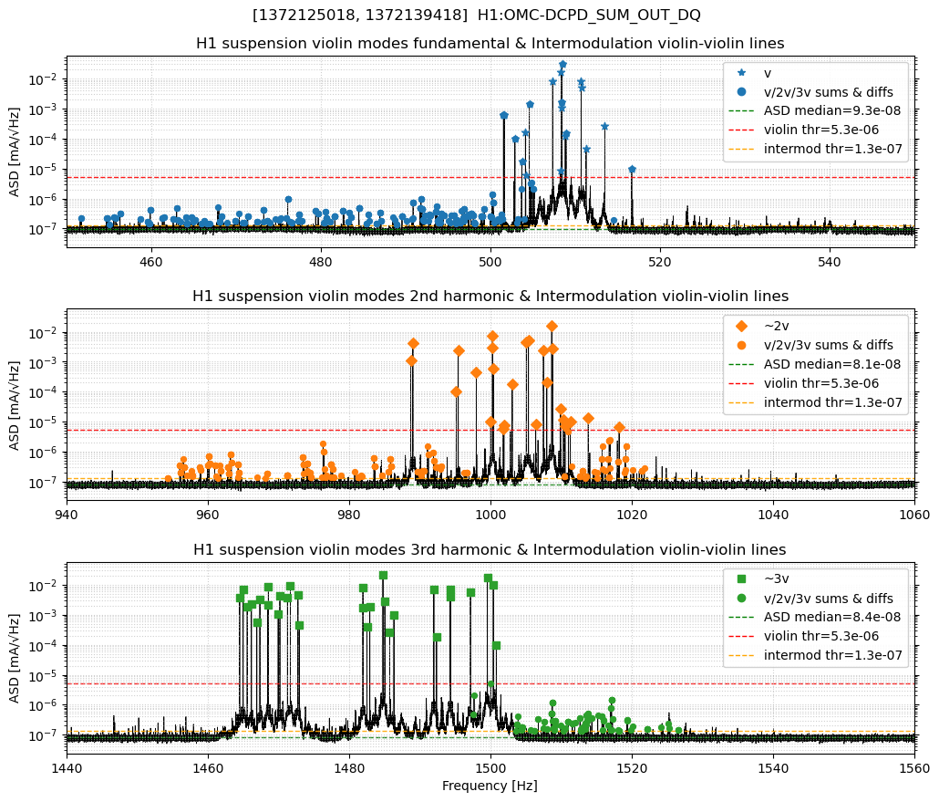 The full-band ASD (about 10 to 1610 Hz) shows violin harmonics near 500 Hz (v), about 1000 Hz (2v), and about 1500 Hz (3v), together with the labeled calibration tones. This context motivates the intermodulation search at violin plus/minus calibration, and at violin-violin sums and differences across the band.