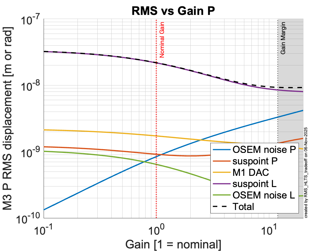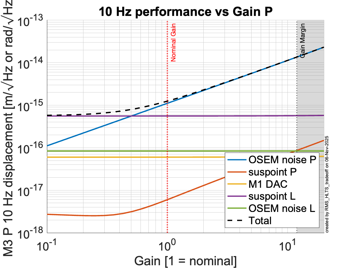 I attach a few plots to show the calculated tradeoffs and noise budgets for the pitch degree of freedom of the bottom mass of SR3. The plots correspond to OSEM-only damping, so they don't reflect the reality of the estimator. Nevertheless, the important thing is that they show that we stand to benefit from increasing the pitch damping gain and squashing the 0.6-0.7 Hz resonances [1st figure] to reduce the M3 pitch RMS [second figure]. We couldn't do that with OSEM-only damping because the OSEM noise would eat us alive [3rd figure]. Now that we have estimators, we should increase the estimator-path gain and see what we can get away with. The details are in T2500367.